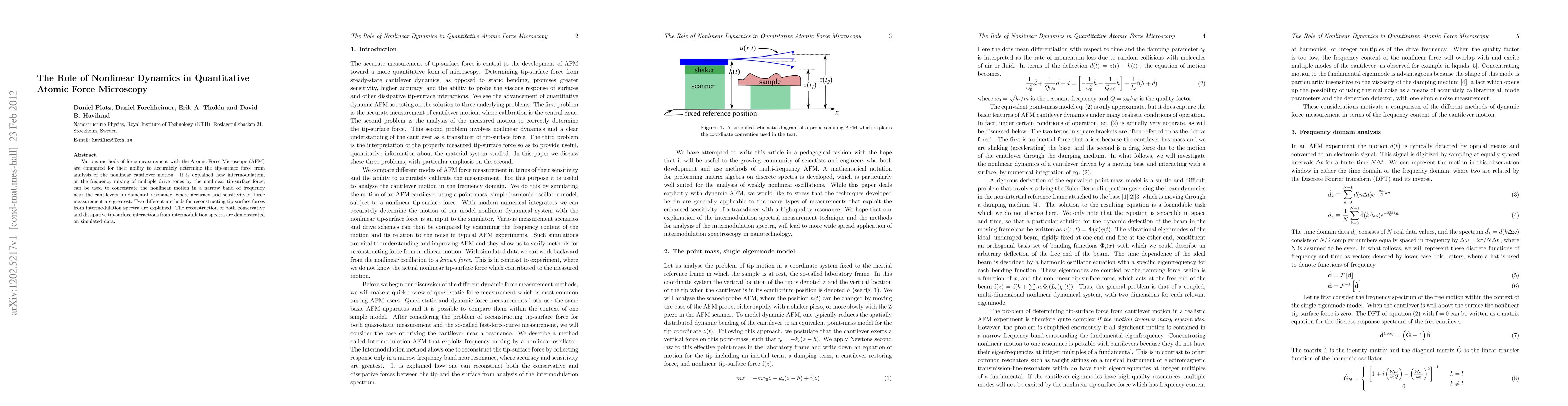 The paper compares various AFM force measurement methods, emphasizing the use of nonlinear dynamics to enhance accuracy by concentrating cantilever motion near its resonance frequency. It demonstrates how intermodulation spectra can reconstruct both conservative and dissipative tip-surface interactions through two different methods, validated with simulated data.