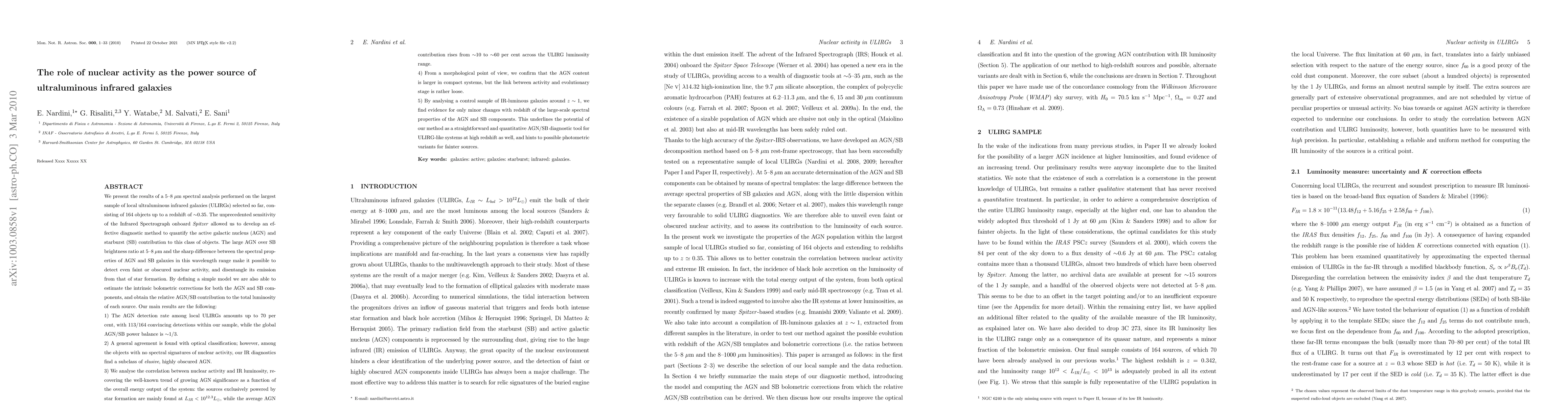 We present the results of a 5-8 micron spectral analysis performed on the largest sample of local ultraluminous infrared galaxies (ULIRGs) selected so far, consisting of 164 objects up to a redshift of ~0.35. The unprecedented sensitivity of the Infrared Spectrograph onboard Spitzer allowed us to develop an effective diagnostic method to disentangle the active galactic nucleus (AGN) and starburst (SB) contribution to this class of objects. The intrinsic bolometric corrections are estimated for both the components, in order to obtain the relative AGN/SB contribution to the total luminosity of each source. Our main results are the following: 1) The AGN detection rate among local ULIRGs amounts up to 70 per cent, with 113/164 convincing detections within our sample, while the global AGN/SB power balance is ~1/3. 2) A general agreement is found with optical classification; however, among the objects with no spectral signatures of nuclear activity, our IR diagnostics find a subclass of elusive, highly obscured AGN. 3) We analyse the correlation between nuclear activity and IR luminosity, recovering the well-known trend of growing AGN significance as a function of the overall energy output of the system: the average AGN contribution rises from ~10 to ~60 per cent across the ULIRG luminosity range. 4) We confirm that the AGN content is larger in compact systems, but the link between activity and evolutionary stage is rather loose. 5) By analysing a control sample of IR-luminous galaxies around z ~ 1, we find evidence for only minor changes with redshift of the large-scale spectral properties of the AGN and SB components. This underlines the potential of our method as a straightforward and quantitative AGN/SB diagnostic tool for ULIRG-like systems at high redshift as well.