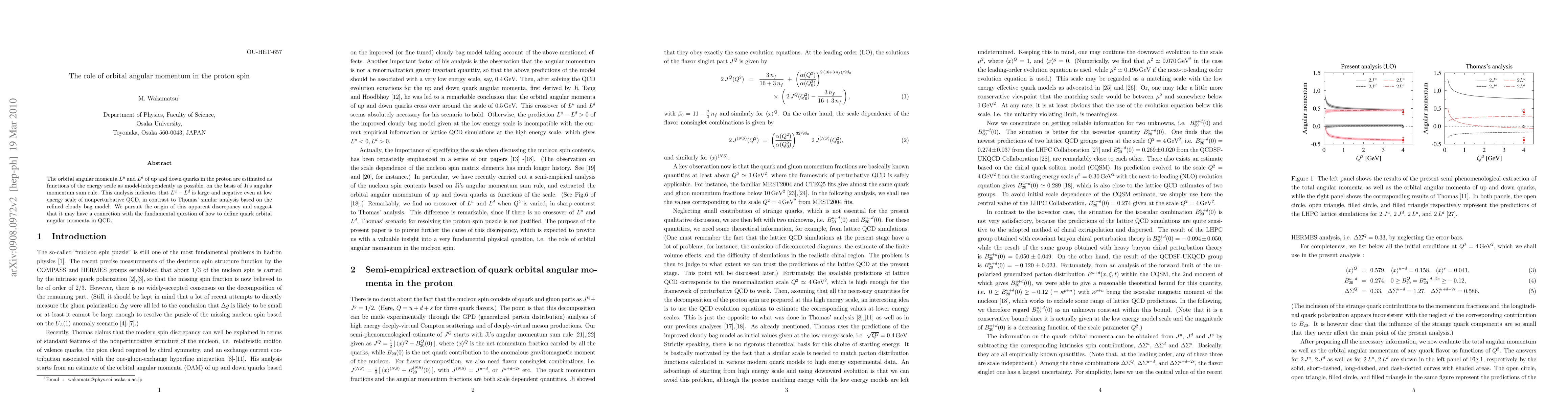 The orbital angular momenta $L^u$ and $L^d$ of up and down quarks in the proton are estimated as functions of the energy scale as model-independently as possible, on the basis of Ji's angular momentum sum rule. This analysis indicates that $L^u - L^d$ is large and negative even at low energy scale of nonperturbative QCD, in contrast to Thomas' similar analysis based on the refined cloudy bag model. We pursuit the origin of this apparent discrepancy and suggest that it may have a connection with the fundamental question of how to define quark orbital angular momenta in QCD.