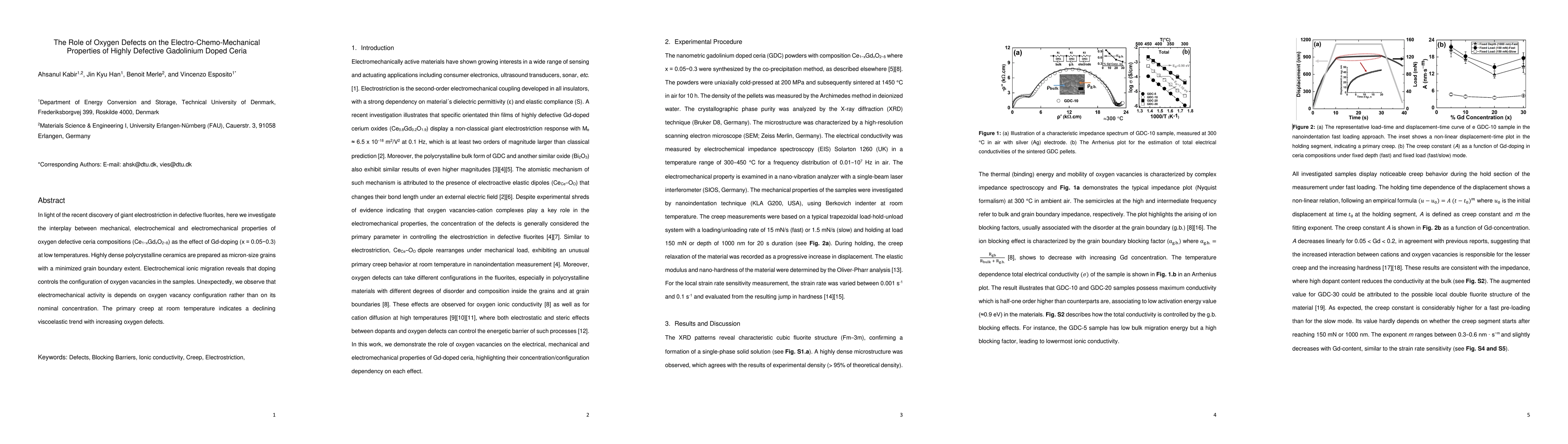 This study explores how oxygen defects influence the electro-chemo-mechanical properties of gadolinium-doped ceria, revealing that the configuration of oxygen vacancies, controlled by Gd-doping, significantly affects electromechanical activity more than the vacancy concentration. The research also finds a declining viscoelastic trend with increasing oxygen defects at room temperature.