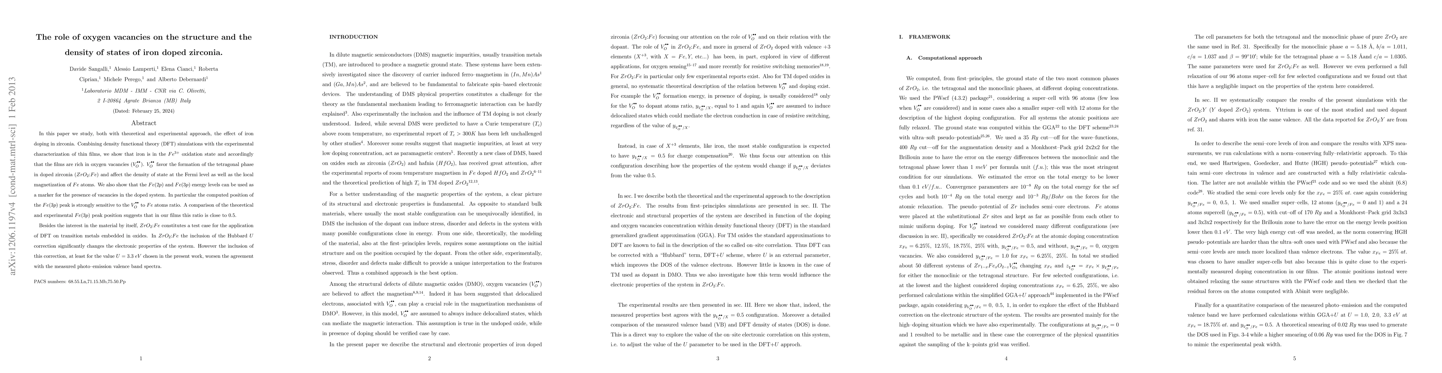 This paper combines theoretical and experimental methods to investigate iron-doped zirconia, revealing that iron exists as Fe3+ and induces a high density of oxygen vacancies (VO). The VO promote the tetragonal phase and modify the density of states and local magnetization, with the Fe(3p) peak position being a sensitive indicator of the VO to Fe ratio, which is estimated to be close to 0.5.