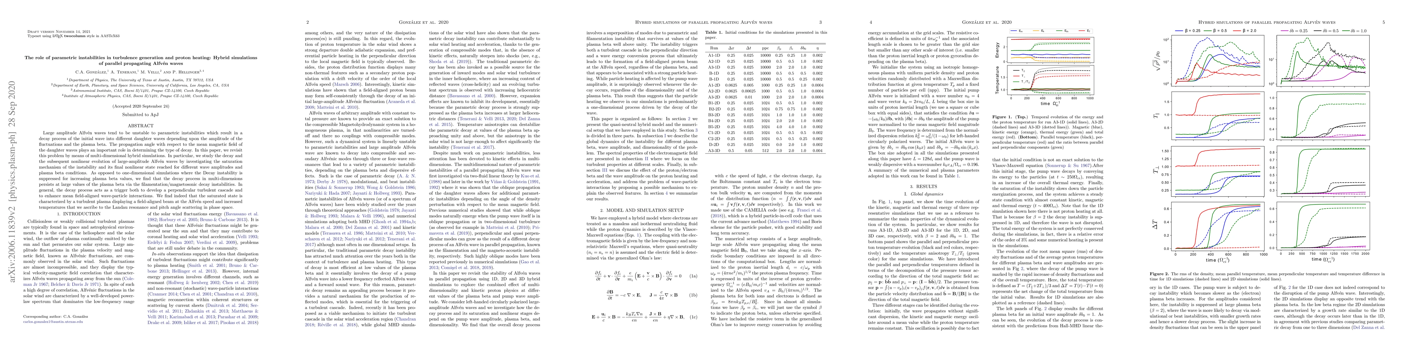 This paper uses multi-dimensional hybrid simulations to explore the decay of large-amplitude Alfv\'en waves into daughter waves, revealing that filamentation/magnetosonic instabilities persist at high plasma beta values. The decay process triggers perpendicular turbulence and enhances proton heating through wave-particle interactions, resulting in increased temperatures due to Landau resonance and pitch angle scattering.