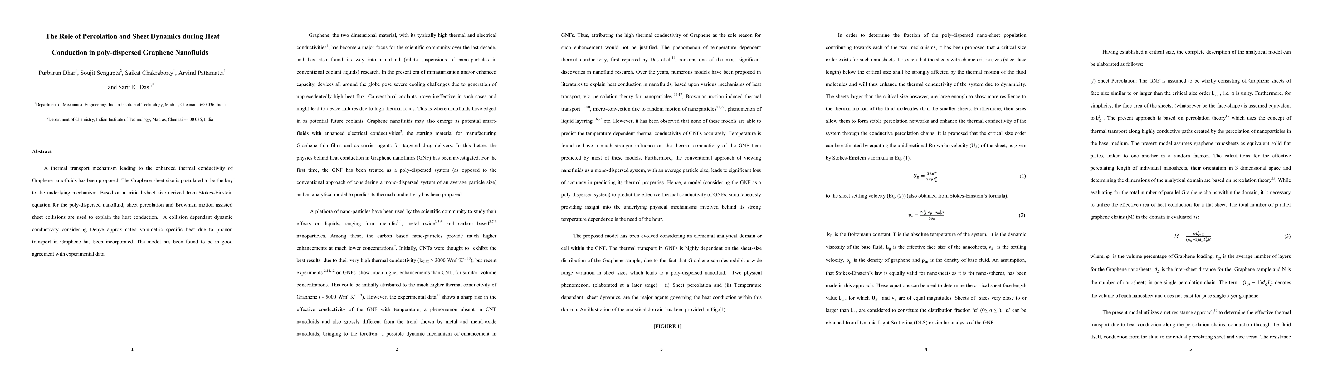 A thermal transport mechanism leading to the enhanced thermal conductivity of Graphene nanofluids has been proposed. The Graphene sheet size is postulated to be the key to the underlying mechanism. Based on a critical sheet size derived from Stokes-Einstein equation for the poly-dispersed nanofluid, sheet percolation and Brownian motion assisted sheet collisions are used to explain the heat conduction. A collision dependant dynamic conductivity considering Debye approximated volumetric specific heat due to phonon transport in Graphene has been incorporated. The model has been found to be in good agreement with experimental data.