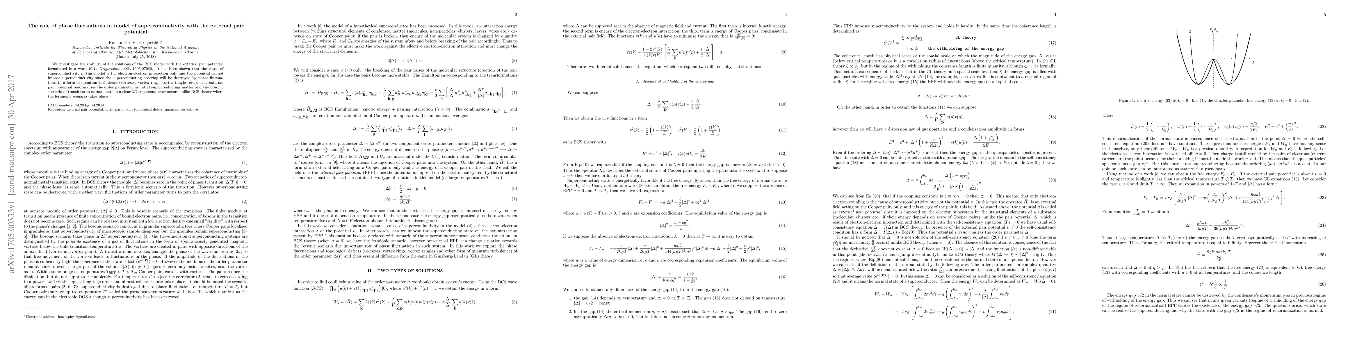 We investigate the stability of the solutions of the BCS model with the external pair potential formulated in a work K.V. Grigorishin arXiv:1605.07080. It has been shown that the cause of superconductivity in this model is the electron-electron interaction only and the potential cannot impose superconductivity since the superconducting ordering will be destroyed by phase fluctuations in a form of quantum turbulence (vortexes, vortex rings, vortex tangles etc.). The external pair potential renormalizes the order parameter in initial superconducting matter and the bosonic scenario of transition to normal state in a clear 3D superconductor occurs unlike BCS theory where the fermionic scenario takes place.