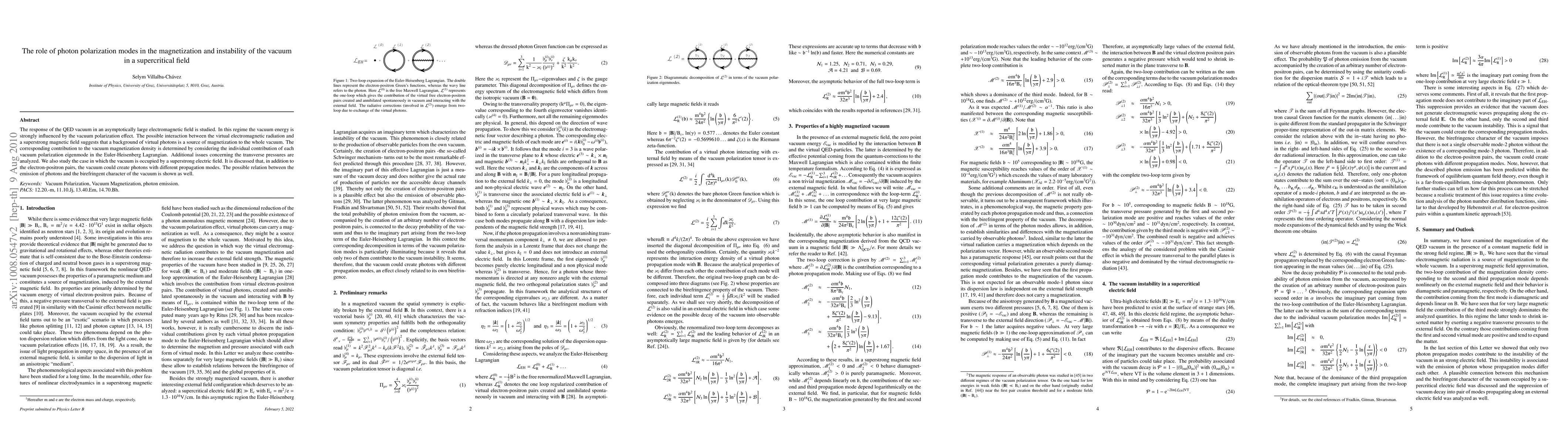 Research investigates how a strong electromagnetic field affects the vacuum energy and magnetization in quantum electrodynamics, finding that virtual photons contribute to the vacuum's magnetic properties. The study also explores the emission of different photon modes and their relation to birefringence in the vacuum.