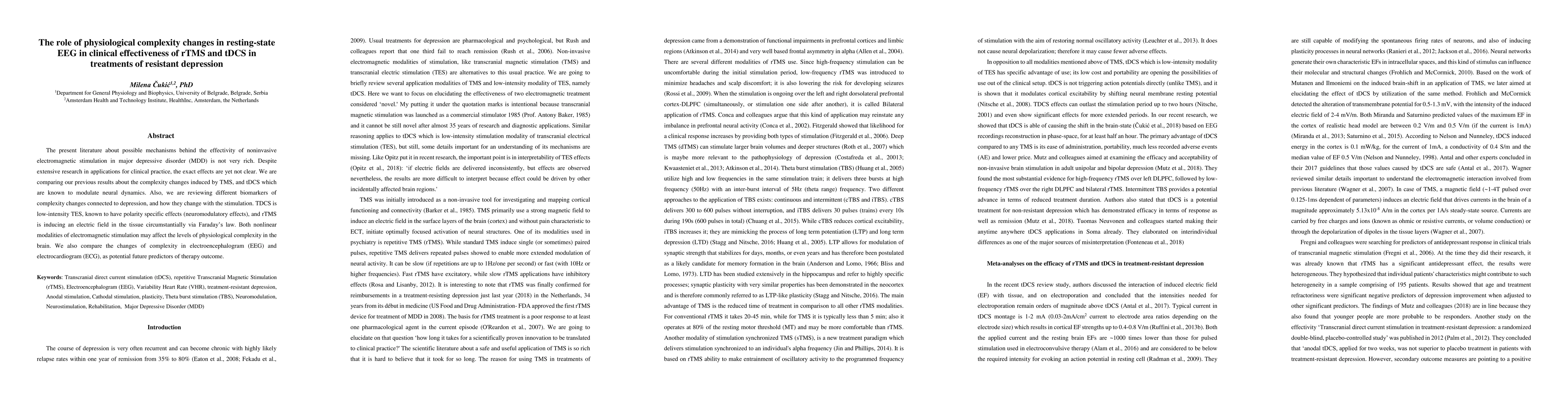 This study investigates how changes in physiological complexity in resting-state EEG correlate with the clinical effectiveness of rTMS and tDCS in treating resistant depression. It compares the modulation of neural dynamics by these two electromagnetic stimulation techniques and explores potential biomarkers of complexity changes in EEG and ECG as predictors of therapy outcomes.