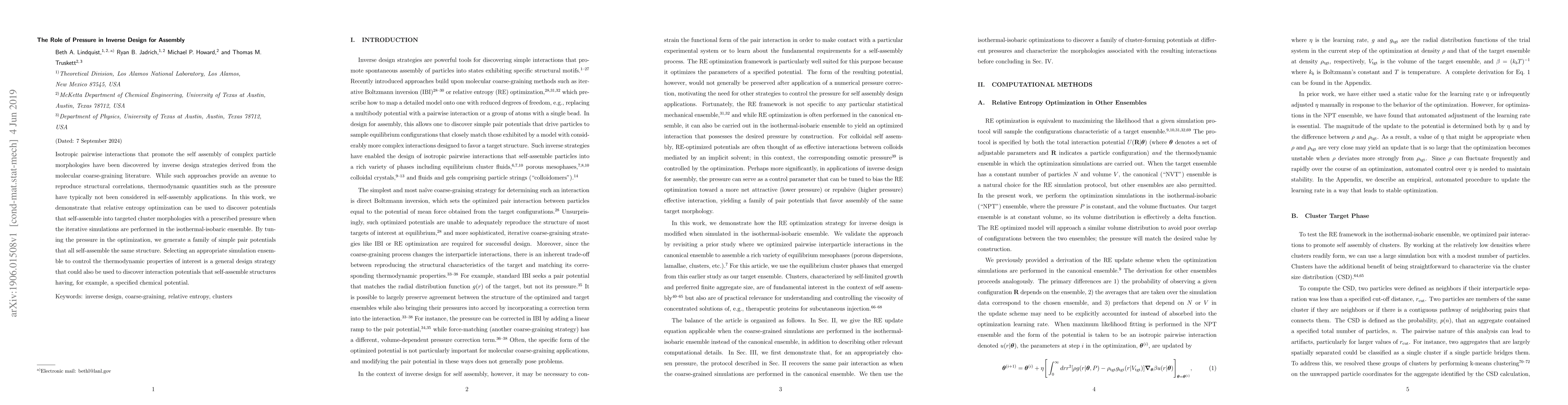 Isotropic pairwise interactions that promote the self assembly of complex particle morphologies have been discovered by inverse design strategies derived from the molecular coarse-graining literature. While such approaches provide an avenue to reproduce structural correlations, thermodynamic quantities such as the pressure have typically not been considered in self-assembly applications. In this work, we demonstrate that relative entropy optimization can be used to discover potentials that self-assemble into targeted cluster morphologies with a prescribed pressure when the iterative simulations are performed in the isothermal-isobaric ensemble. By tuning the pressure in the optimization, we generate a family of simple pair potentials that all self-assemble the same structure. Selecting an appropriate simulation ensemble to control the thermodynamic properties of interest is a general design strategy that could also be used to discover interaction potentials that self-assemble structures having, for example, a specified chemical potential.