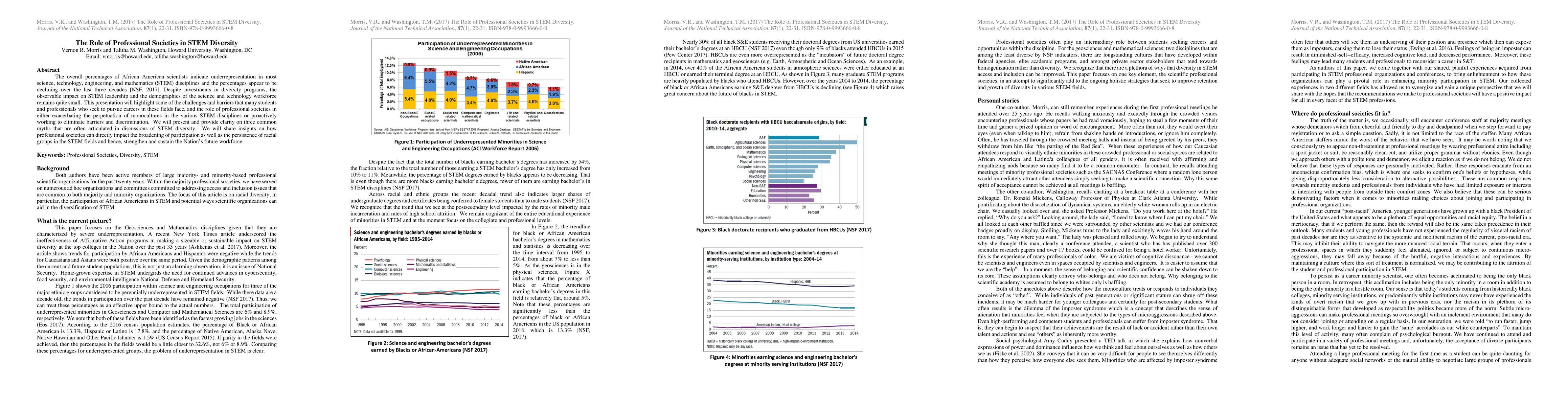 The overall percentages of African American scientists indicate underrepresentation in most science, technology, engineering, and mathematics (STEM) disciplines and the percentages appear to be declining over the last three decades. We will share insights on how professional societies can directly impact the broadening of participation as well as the persistence of racial groups in the STEM fields and hence, strengthen and sustain the Nation's future workforce.
