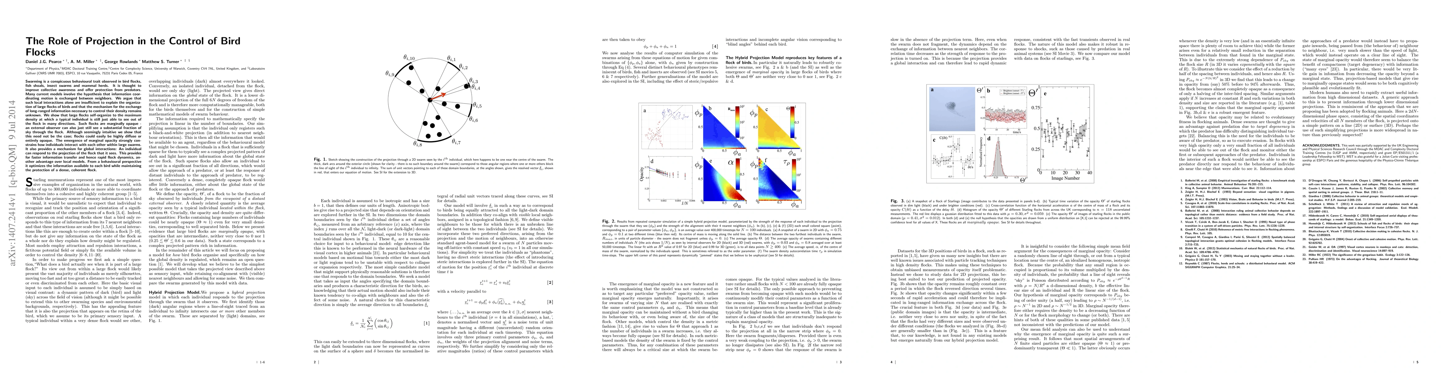 Swarming is a conspicuous behavioural trait observed in bird flocks, fish shoals, insect swarms and mammal herds. It is thought to improve collective awareness and offer protection from predators. Many current models involve the hypothesis that information coordinating motion is exchanged between neighbors. We argue that such local interactions alone are insufficient to explain the organization of large flocks of birds and that the mechanism for the exchange of long-ranged information necessary to control their density remains unknown. We show that large flocks self-organize to the maximum density at which a typical individual is still just able to see out of the flock in many directions. Such flocks are marginally opaque - an external observer can also just still see a substantial fraction of sky through the flock. Although seemingly intuitive we show that this need not be the case; flocks could easily be highly diffuse or entirely opaque. The emergence of marginal opacity strongly constrains how individuals interact with each other within large swarms. It also provides a mechanism for global interactions: An individual can respond to the projection of the flock that it sees. This provides for faster information transfer and hence rapid flock dynamics, another advantage over local models. From a behavioural perspective it optimizes the information available to each bird while maintaining the protection of a dense, coherent flock.