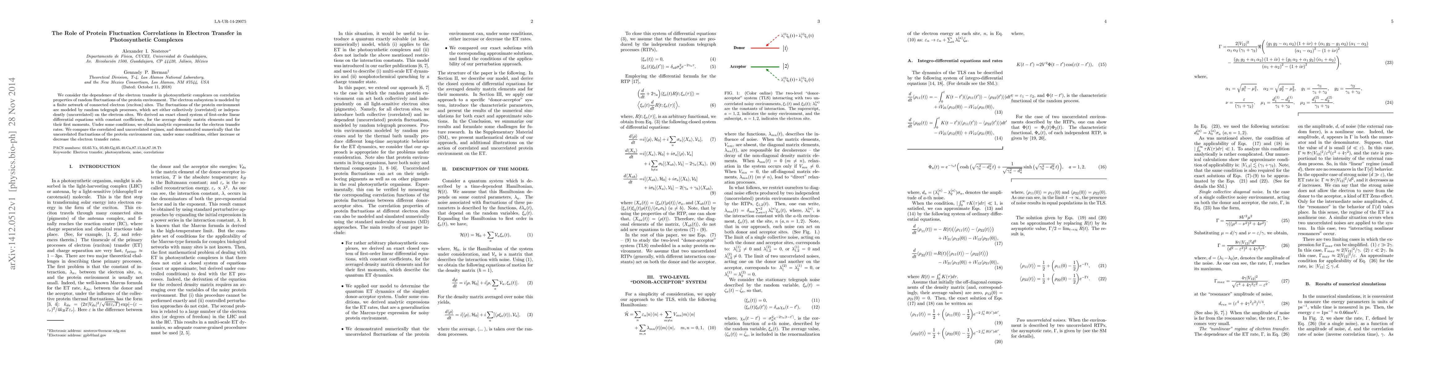 This paper investigates how random fluctuations in the protein environment influence electron transfer in photosynthetic complexes, modeling the protein environment as random telegraph processes. The study derives exact differential equations for the average density matrix and finds that uncorrelated fluctuations can either enhance or inhibit electron transfer rates, depending on specific conditions.