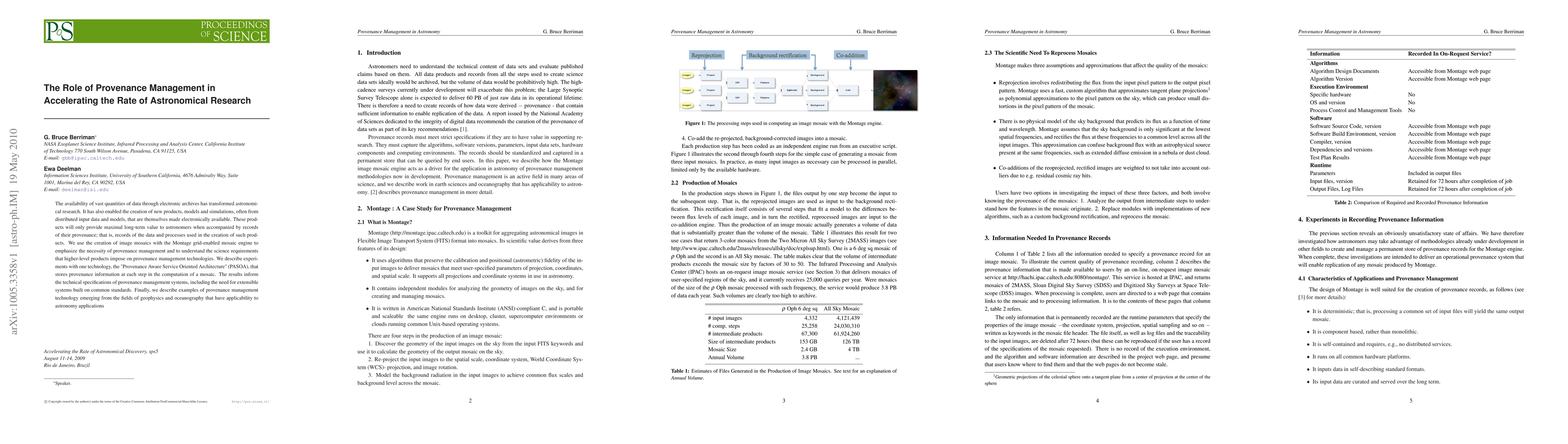 This paper explores how provenance management enhances the value of astronomical research by documenting the data and processes used to create scientific products. It highlights the importance of such records through experiments with the Montage engine and the Provenance Aware Service Oriented Architecture (PASOA), advocating for extensible systems based on common standards.