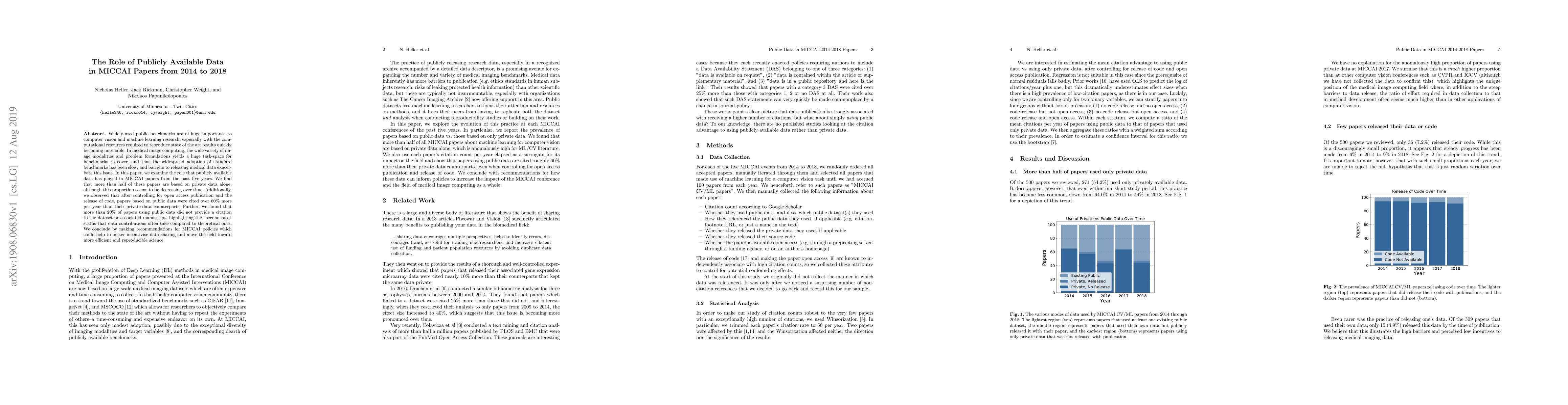 The paper analyzes MICCAI papers from 2014-2018, finding that over half initially relied on private data, but this trend is decreasing. Public data-based papers receive 60% more citations annually, yet 20% lack proper dataset citations, indicating undervaluation of data contributions. The authors propose policy changes to encourage data sharing for reproducible, efficient medical image computing research.