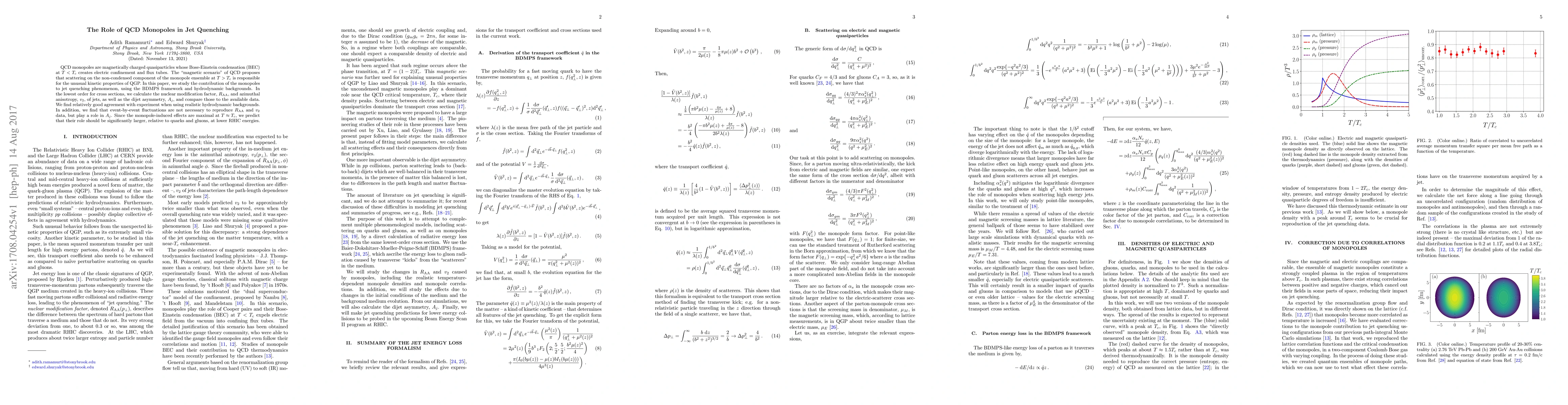 The paper presents a comprehensive analysis of jet quenching phenomena using the BDMPS formalism, incorporating monopoles and comparing results with experimental data from RHIC and LHC energies.