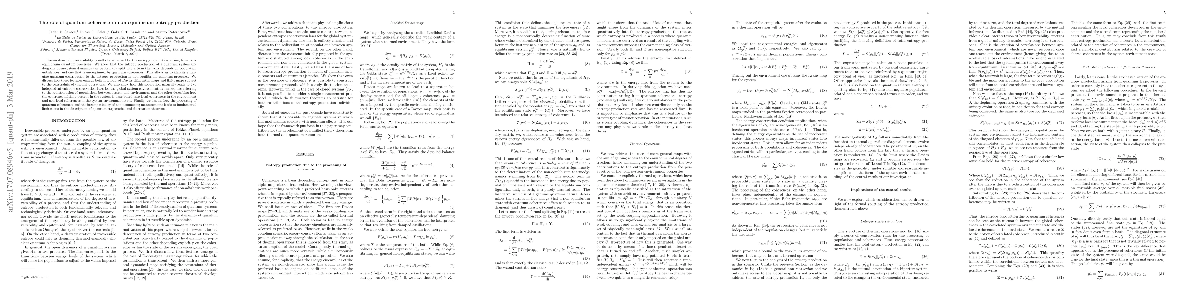 This paper investigates how quantum coherence influences entropy production in non-equilibrium quantum systems, demonstrating that entropy production can be divided into contributions from population unbalances and quantum coherences. It identifies a distinct quantum contribution to entropy production due to decoherence, using a spin-coherent representation of open-system dynamics.
