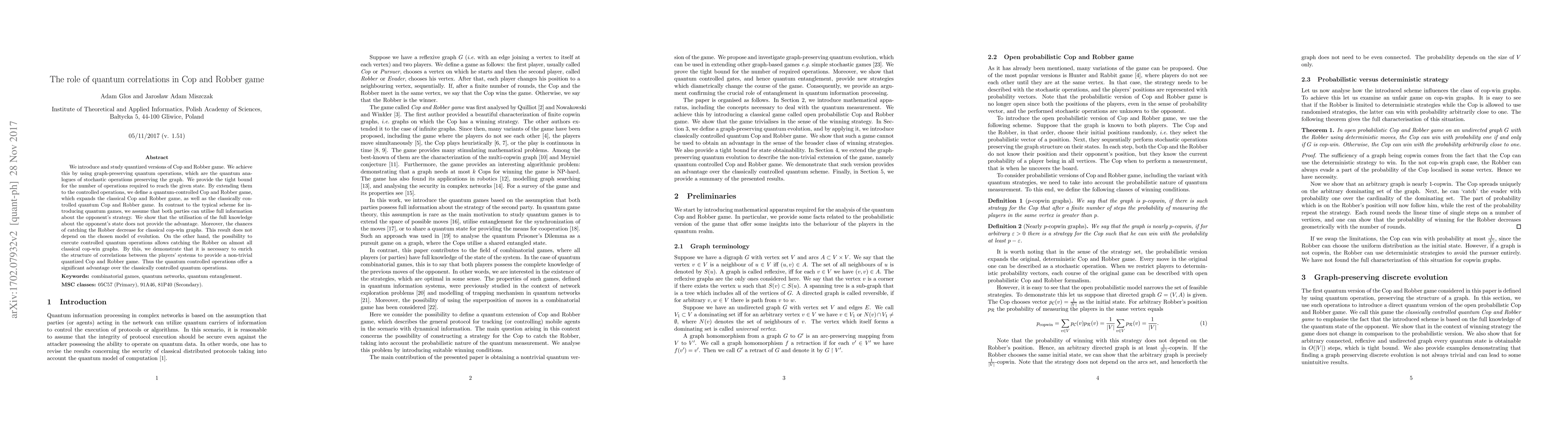 We introduce and study quantized versions of Cop and Robber game. We achieve this by using graph-preserving quantum operations, which are the quantum analogues of stochastic operations preserving the graph. We provide the tight bound for the number of operations required to reach the given state. By extending them to the controlled operations, we define a quantum-controlled Cop and Robber game, which expands the classical Cop and Robber game, as well as the classically controlled quantum Cop and Robber game. In contrast to the typical scheme for introducing quantum games, we assume that both parties can utilise full information about the opponent's strategy. We show that the utilisation of the full knowledge about the opponent's state does not provide the advantage. Moreover, the chances of catching the Robber decrease for classical cop-win graphs. This result does not depend on the chosen model of evolution. On the other hand, the possibility to execute controlled quantum operations allows catching the Robber on almost all classical cop-win graphs. By this, we demonstrate that it is necessary to enrich the structure of correlations between the players' systems to provide a non-trivial quantized Cop and Robber game. Thus the quantum controlled operations offer a significant advantage over the classically controlled quantum operations.