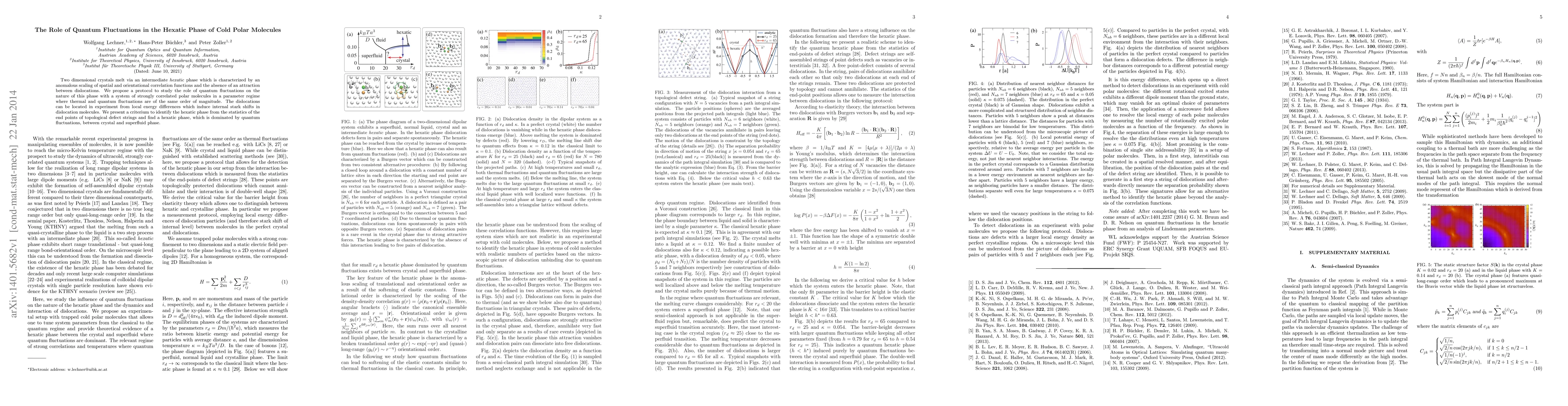 This paper investigates the hexatic phase in two-dimensional crystals of cold polar molecules, proposing a method to study quantum fluctuations' role in this phase. The study finds a hexatic phase dominated by quantum fluctuations, identified through statistical analysis of topological defect strings, between the crystal and superfluid phases.