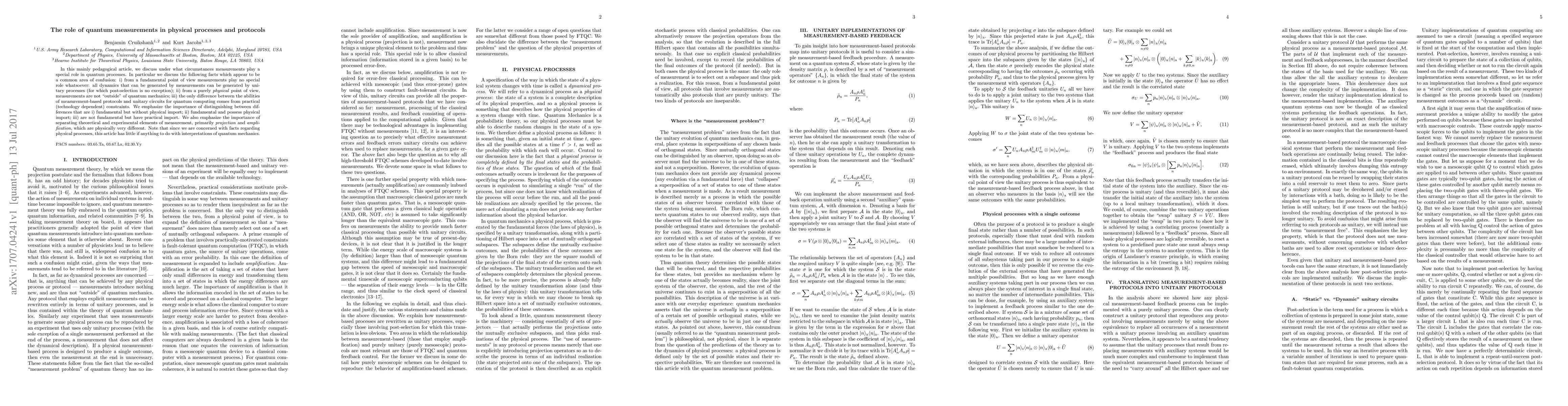 In this mainly pedagogical article, we discuss under what circumstances measurements play a special role in quantum processes. In particular we discuss the following facts which appear to be a common area of confusion: i) from a fundamental point of view measurements play no special role whatsoever: all dynamics that can be generated by measurements can be generated by unitary processes (for which post-selection is no exception), ii) from a purely physical point of view, measurements are not "outside" of quantum mechanics, iii) the only difference between the abilities of measurement-based protocols and unitary circuits for quantum computing comes from practical (technology dependent) constraints. We emphasize the importance of distinguishing between differences that are i) fundamental but without physical import, ii) fundamental and possess physical import, iii) are not fundamental but have practical import. We also emphasize the importance of separating theoretical and experimental elements of measurement, primarily projection and amplification, which are physically very different. Note that since we are concerned with facts regarding physical processes, this article has little if anything to do with interpretations of quantum mechanics.