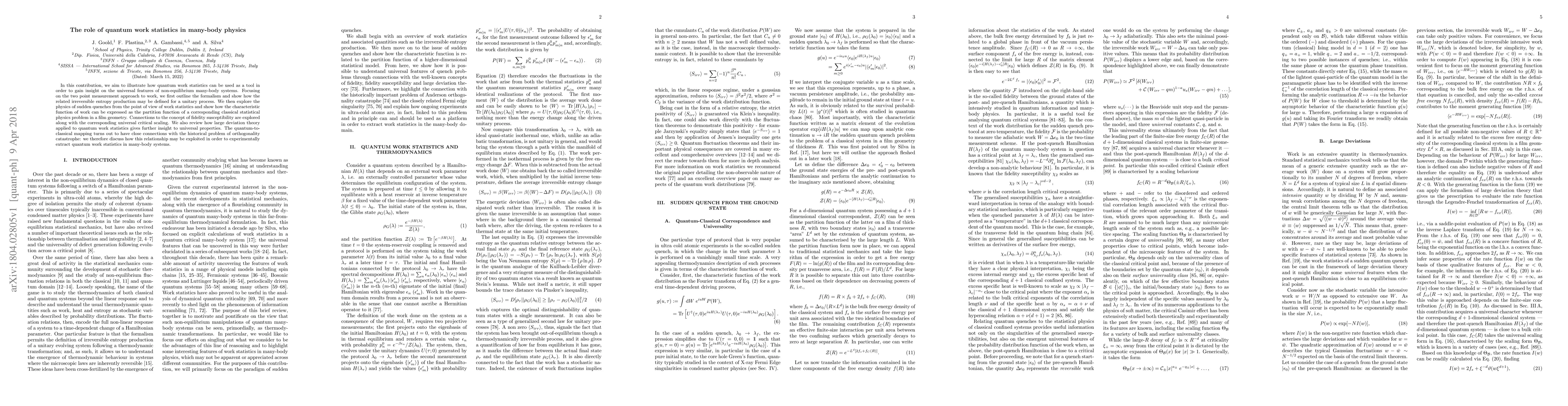 In this contribution, we aim to illustrate how quantum work statistics can be used as a tool in order to gain insight on the universal features of non-equilibrium many-body systems. Focusing on the two point measurement approach to work, we first outline the formalism and show how the related irreversible entropy production may be defined for a unitary process. We then explore the physics of sudden quenches from the point of view of work statistics and show how the characteristic function of work can be expressed as the partition function of a corresponding classical statistical physics problem in a film geometry. Connections to the concept of fidelity susceptibility are explored along with the corresponding universal critical scaling. We also review how large deviation theory applied to quantum work statistics gives further insight to universal properties. The quantum-to- classical mapping turns out to have close connections with the historical problem of orthogonality catastrophe: we therefore discuss how this relationship may be exploited in order to experimentally extract quantum work statistics in many-body systems.