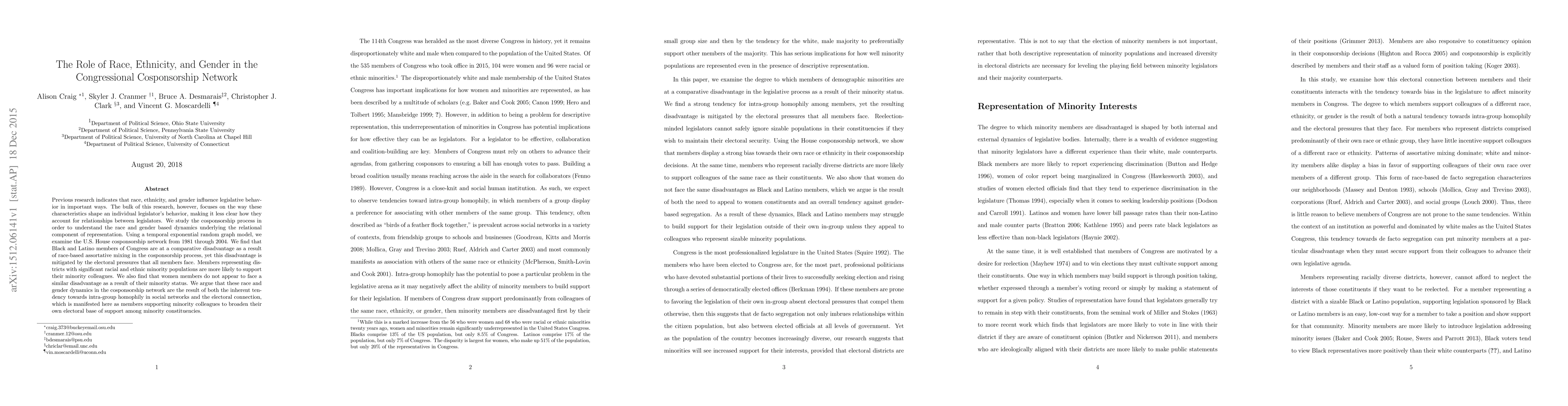 This study examines the influence of race, ethnicity, and gender on congressional cosponsorship networks, revealing that Black and Latino legislators face disadvantages due to race-based assortative mixing, though this is somewhat offset by electoral incentives. Women legislators do not experience similar disadvantages, highlighting complex dynamics shaped by both social homophily and electoral strategies.