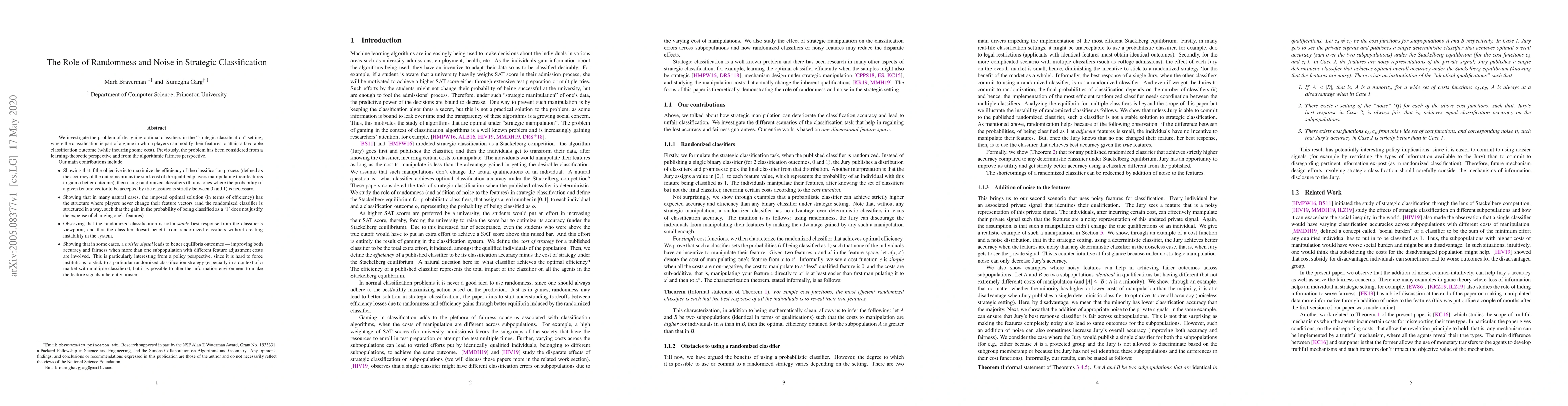 We investigate the problem of designing optimal classifiers in the strategic classification setting, where the classification is part of a game in which players can modify their features to attain a favorable classification outcome (while incurring some cost). Previously, the problem has been considered from a learning-theoretic perspective and from the algorithmic fairness perspective. Our main contributions include 1. Showing that if the objective is to maximize the efficiency of the classification process (defined as the accuracy of the outcome minus the sunk cost of the qualified players manipulating their features to gain a better outcome), then using randomized classifiers (that is, ones where the probability of a given feature vector to be accepted by the classifier is strictly between 0 and 1) is necessary. 2. Showing that in many natural cases, the imposed optimal solution (in terms of efficiency) has the structure where players never change their feature vectors (the randomized classifier is structured in a way, such that the gain in the probability of being classified as a 1 does not justify the expense of changing one's features). 3. Observing that the randomized classification is not a stable best-response from the classifier's viewpoint, and that the classifier doesn't benefit from randomized classifiers without creating instability in the system. 4. Showing that in some cases, a noisier signal leads to better equilibria outcomes -- improving both accuracy and fairness when more than one subpopulation with different feature adjustment costs are involved. This is interesting from a policy perspective, since it is hard to force institutions to stick to a particular randomized classification strategy (especially in a context of a market with multiple classifiers), but it is possible to alter the information environment to make the feature signals inherently noisier.