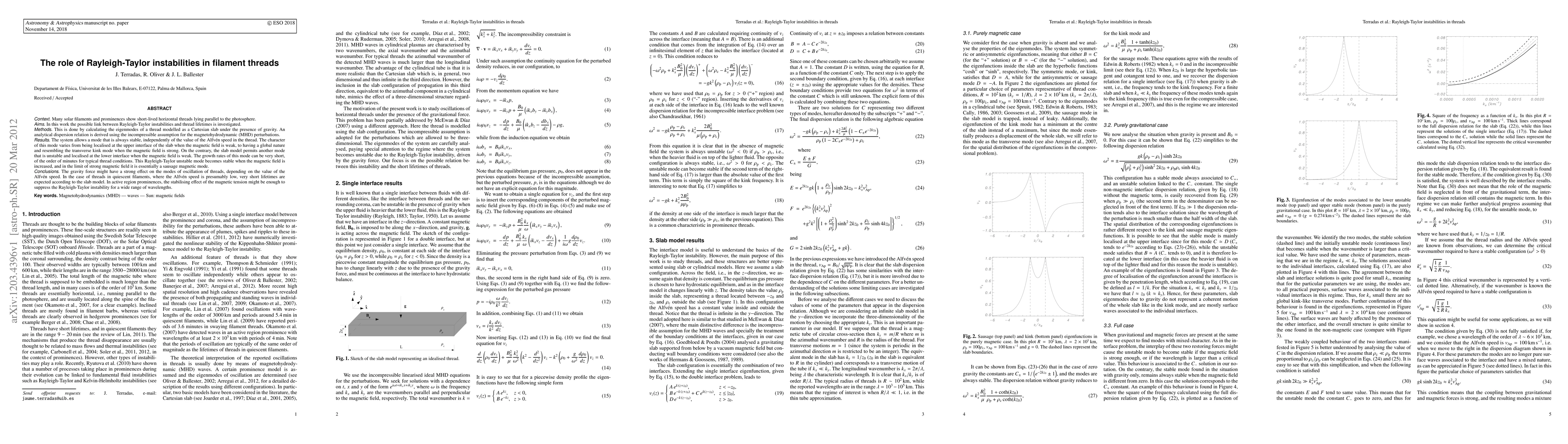 This research investigates the role of Rayleigh-Taylor instabilities in solar filament threads, deriving an analytical dispersion relation for a thread modelled as a Cartesian slab. It finds that one mode is always stable, while another is unstable and localised at the lower interface when the magnetic field is weak, growing in minutes. The gravity force significantly impacts thread oscillation modes, suggesting very short lifetimes for threads in quiescent filaments with low Alfvén speed, and potential suppression of instability in active region prominences due to magnetic tension.