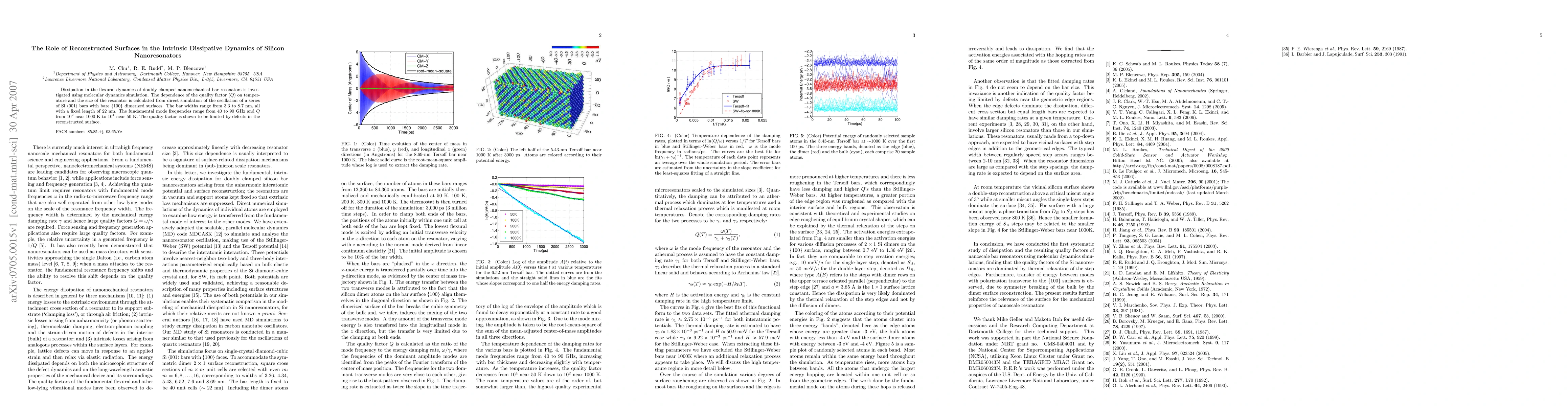 Dissipation in the flexural dynamics of doubly clamped nanomechanical bar resonators is investigated using molecular dynamics simulation. The dependence of the quality factor Q on temperature and the size of the resonator is calculated from direct simulation of the oscillation of a series of Si <001> bars with bare {100} dimerized surfaces. The bar widths range from 3.3 to 8.7nm, all with a fixed length of 22nm. The fundamental mode frequencies range from 40 to 90GHz and Q from 10^2 near 1000K to 10^4 near 50K. The quality factor is shown to be limited by defects in the reconstructed surface.