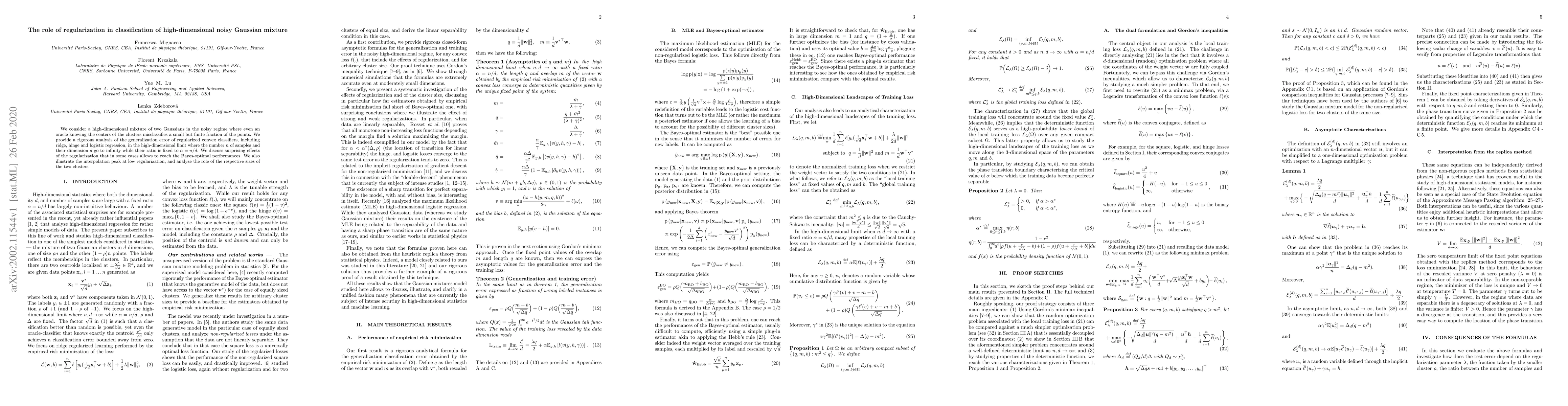 We consider a high-dimensional mixture of two Gaussians in the noisy regime where even an oracle knowing the centers of the clusters misclassifies a small but finite fraction of the points. We provide a rigorous analysis of the generalization error of regularized convex classifiers, including ridge, hinge and logistic regression, in the high-dimensional limit where the number $n$ of samples and their dimension $d$ go to infinity while their ratio is fixed to $\alpha= n/d$. We discuss surprising effects of the regularization that in some cases allows to reach the Bayes-optimal performances. We also illustrate the interpolation peak at low regularization, and analyze the role of the respective sizes of the two clusters.