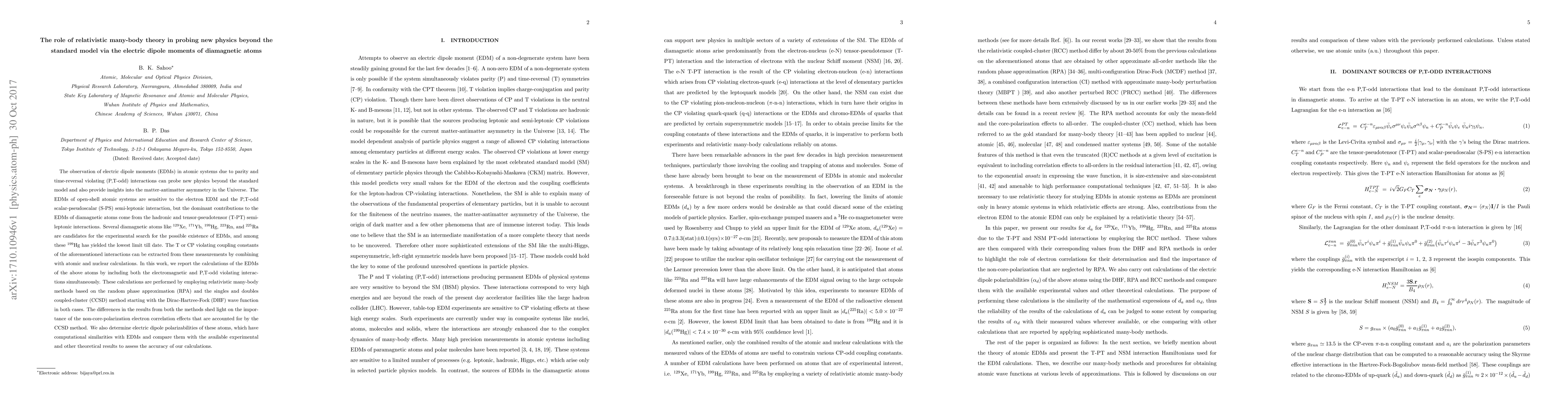 This paper investigates the electric dipole moments (EDMs) of diamagnetic atoms like $^{129}$Xe, $^{171}$Yb, $^{199}$Hg, $^{223}$Rn, and $^{225}$Ra using relativistic many-body theory, aiming to probe new physics beyond the Standard Model. The study employs RPA and CCSD methods to account for electromagnetic and P,T-odd interactions, highlighting the significance of non-core-polarization electron correlation effects.
