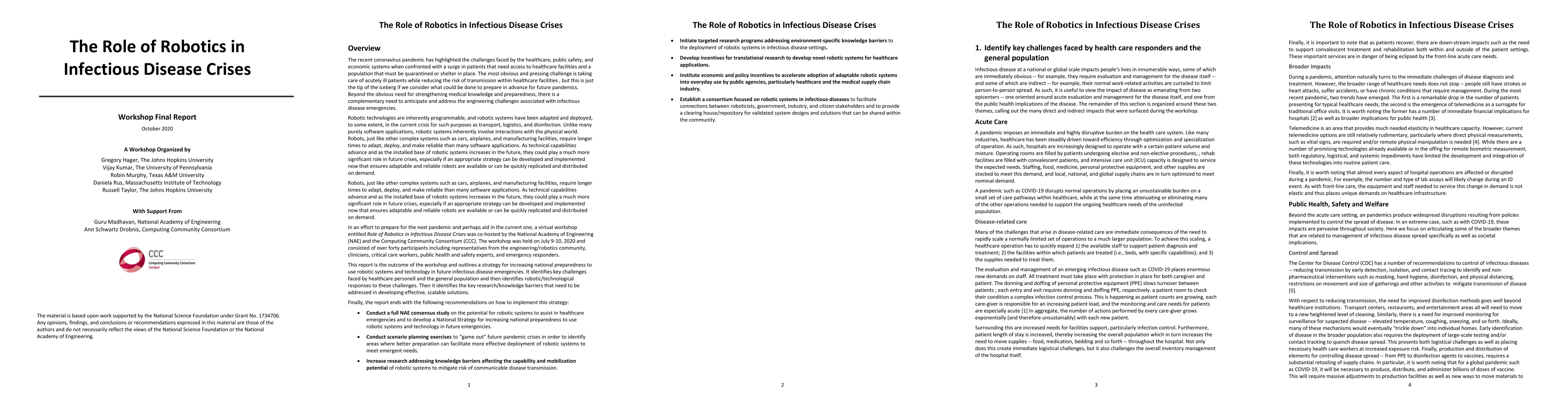 The recent coronavirus pandemic has highlighted the many challenges faced by the healthcare, public safety, and economic systems when confronted with a surge in patients that require intensive treatment and a population that must be quarantined or shelter in place. The most obvious and pressing challenge is taking care of acutely ill patients while managing spread of infection within the care facility, but this is just the tip of the iceberg if we consider what could be done to prepare in advance for future pandemics. Beyond the obvious need for strengthening medical knowledge and preparedness, there is a complementary need to anticipate and address the engineering challenges associated with infectious disease emergencies. Robotic technologies are inherently programmable, and robotic systems have been adapted and deployed, to some extent, in the current crisis for such purposes as transport, logistics, and disinfection. As technical capabilities advance and as the installed base of robotic systems increases in the future, they could play a much more significant role in future crises. This report is the outcome of a virtual workshop co-hosted by the National Academy of Engineering (NAE) and the Computing Community Consortium (CCC) held on July 9-10, 2020. The workshop consisted of over forty participants including representatives from the engineering/robotics community, clinicians, critical care workers, public health and safety experts, and emergency responders. It identifies key challenges faced by healthcare responders and the general population and then identifies robotic/technological responses to these challenges. Then it identifies the key research/knowledge barriers that need to be addressed in developing effective, scalable solutions. Finally, the report ends with the following recommendations on how to implement this strategy.