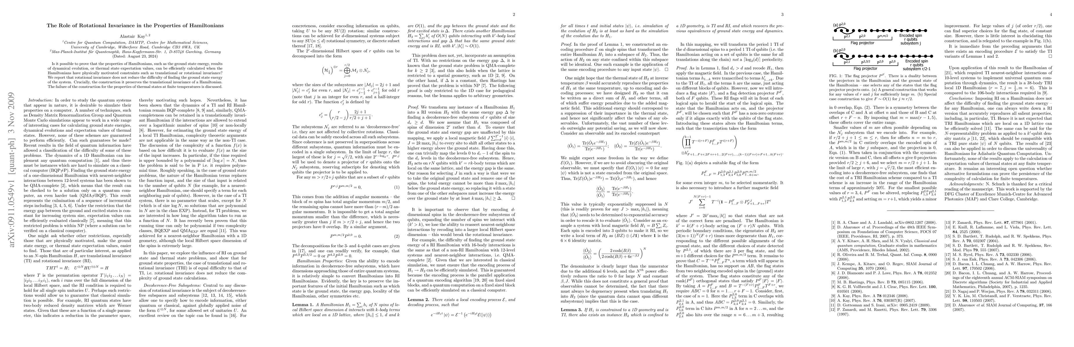 Is it possible to prove that the properties of Hamiltonians, such as the ground state energy, results of dynamical evolution, or thermal state expectation values, can be efficiently calculated when the Hamiltonians have physically motivated constraints such as translational or rotational invariance? We report that rotational invariance does not reduce the difficulty of finding the ground state energy of the system. Crucially, the construction it preserves the translational invariance of a Hamiltonian. The failure of the construction for the properties of thermal states at finite temperatures is discussed.