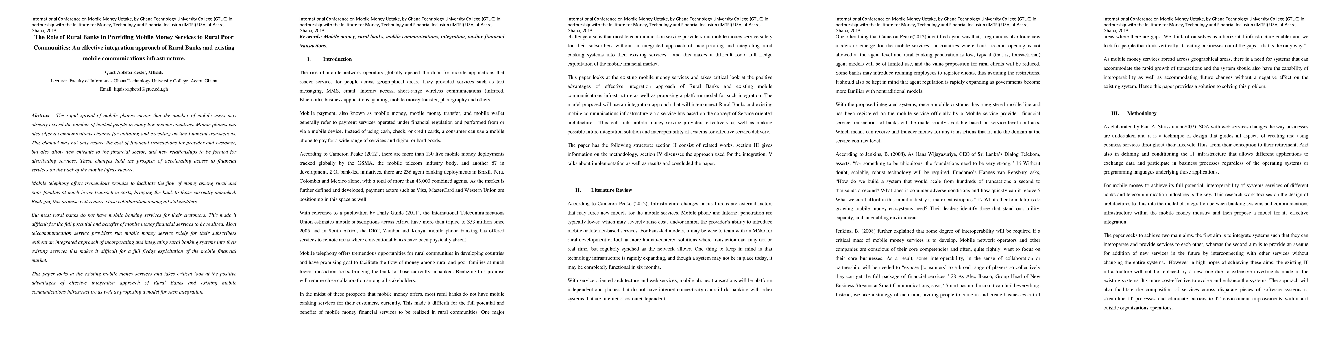 This paper explores how rural banks can leverage existing mobile communications infrastructure to provide mobile money services to rural poor communities, emphasizing the need for an integrated approach to maximize the benefits and overcome current limitations in mobile financial services. It proposes a model for effective integration to enhance access to financial services.