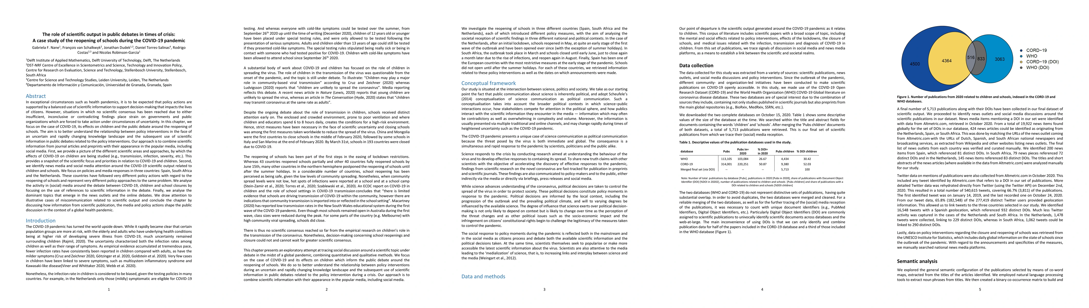 Situations in which no scientific consensus has been reached due to either insufficient, inconclusive or contradicting findings place strain on governments and public organizations which are forced to take action under circumstances of uncertainty. In this chapter, we focus on the case of COVID-19, its effects on children and the public debate around the reopening of schools. The aim is to better understand the relationship between policy interventions in the face of an uncertain and rapidly changing knowledge landscape and the subsequent use of scientific information in public debates related to the policy interventions. Our approach is to combine scientific information from journal articles and preprints with their appearance in the popular media, including social media. First, we provide a picture of the different scientific areas and approaches, by which the effects of COVID-19 on children are being studied. Second, we identify news media and social media attention around the COVID-19 scientific output related to children and schools. We focus on policies and media responses in three countries: Spain, South Africa and the Netherlands. These countries have followed very different policy actions with regard to the reopening of schools and represent very different policy approaches to the same problem. We analyse the activity in (social) media around the debate between COVID-19, children and school closures by focusing on the use of references to scientific information in the debate. Finally, we analyse the dominant topics that emerge in the news outlets and the online debates. We draw attention to illustrative cases of miscommunication related to scientific output and conclude the chapter by discussing how information from scientific publication, the media and policy actions shape the public discussion in the context of a global health pandemic.