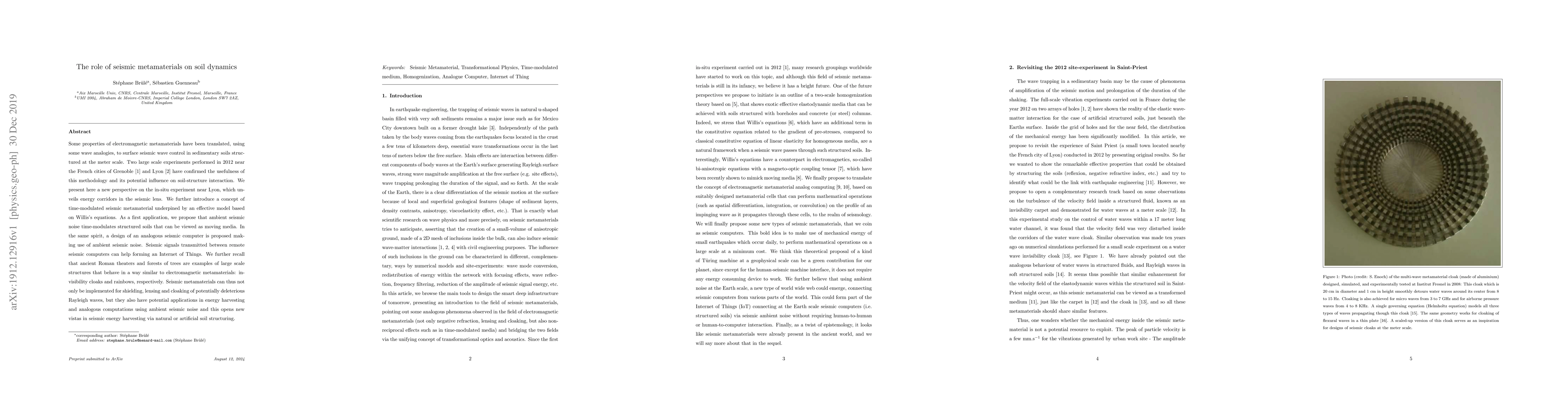 Some properties of electromagnetic metamaterials have been translated, using some wave analogies, to surface seismic wave control in sedimentary soils structured at the meter scale. Two large scale experiments performed in 2012 near the French cities of Grenoble [Brule et al., PRL 112, 133901, 2014] and Lyon [Brule et al., Sci. Rep. 7, 18066, 2017] have confirmed the usefulness of this methodology and its potential influence on soil-structure interaction. We present here a new perspective on the in-situ experiment near Lyon, which unveils energy corridors in the seismic lens. We further introduce a concept of time-modulated seismic metamaterial underpined by an effective model based on Willis's equations. As a first application, we propose that ambient seismic noise time-modulates structured soils that can be viewed as moving media. In the same spirit, a design of an analogous seismic computer is proposed making use of ambient seismic noise. Seismic signals transmitted between remote seismic computers can help forming an Internet of Things. We further recall that ancient Roman theaters and forests of trees are examples of large scale structures that behave in a way similar to electromagnetic metamaterials: invisibility cloaks and rainbows, respectively. Seismic metamaterials can thus not only be implemented for shielding, lensing and cloaking of potentially deleterious Rayleigh waves, but they also have potential applications in energy harvesting and analogous computations using ambient seismic noise and this opens new vistas in seismic energy harvesting via natural or artificial soil structuring.