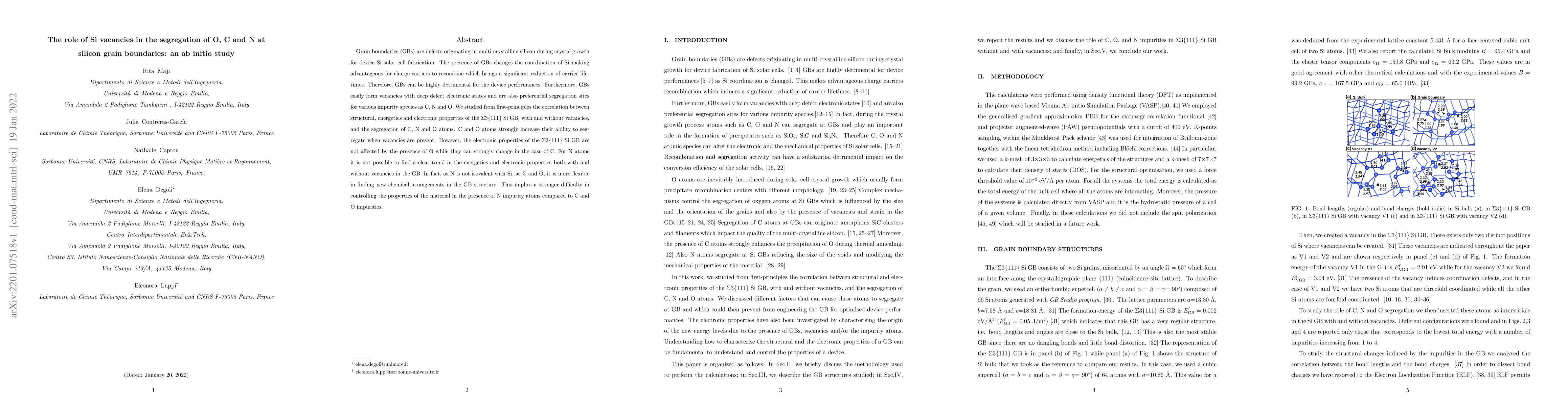 Grain boundaries (GBs) are defects originating in multi-crystalline silicon during crystal growth for device Si solar cell fabrication. The presence of GBs changes the coordination of Si, making it advantageous for charge carriers to recombine, which brings a significant reduction of carrier lifetimes. Therefore, GBs can be highly detrimental for device performances. Furthermore, GBs easily form vacancies with deep defect electronic states and are also preferential segregation sites for various impurity species, such as C, N, and O. We studied from first principles the correlation between structural, energetics, and electronic properties of the $\Sigma$3{111} Si GB with and without vacancies, and the segregation of C, N, and O atoms. C and O atoms strongly increase their ability to segregate when vacancies are present. However, the electronic properties of the $\Sigma$3{111} Si GB are not affected by the presence of O, while they can strongly change in the case of C. For N atoms, it is not possible to find a clear trend in the energetics and electronic properties both with and without vacancies in the GB. In fact, as N is not isovalent with Si, as C and O, it is more flexible in finding new chemical arrangements in the GB structure. This implies a stronger difficulty in controlling the properties of the material in the presence of N impurity atoms compared to C and O impurities.