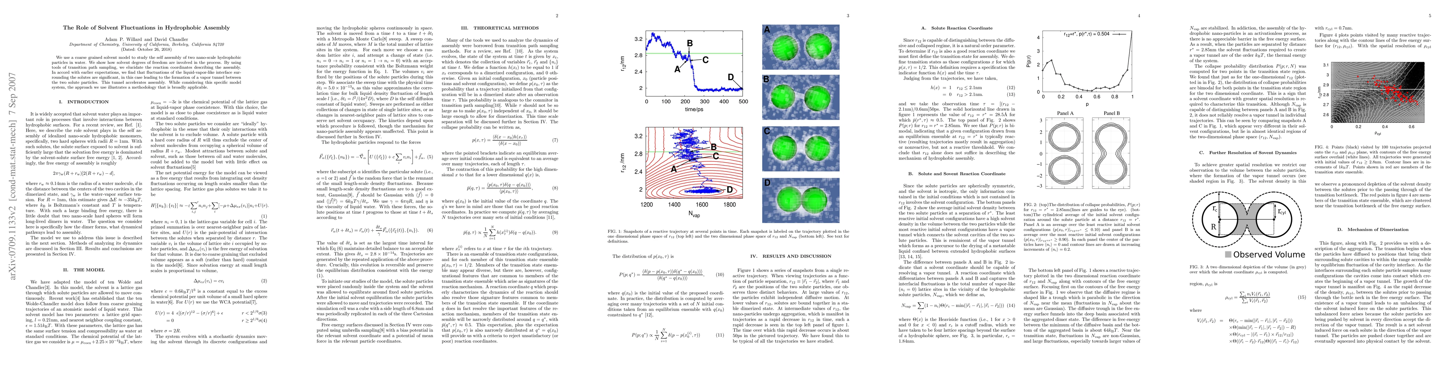 We use a coarse grained solvent model to study the self assembly of two nano-scale hydrophobic particles in water. We show how solvent degrees of freedom are involved in the process. By using tools of transition path sampling, we elucidate the reaction coordinates describing the assembly. In accord with earlier expectations, we find that fluctuations of the liquid-vapor-like interface surrounding the solutes are significant, in this case leading to the formation of a vapor tunnel between the two solute particles. This tunnel accelerates assembly. While considering this specific model system, the approach we use illustrates a methodology that is broadly applicable.