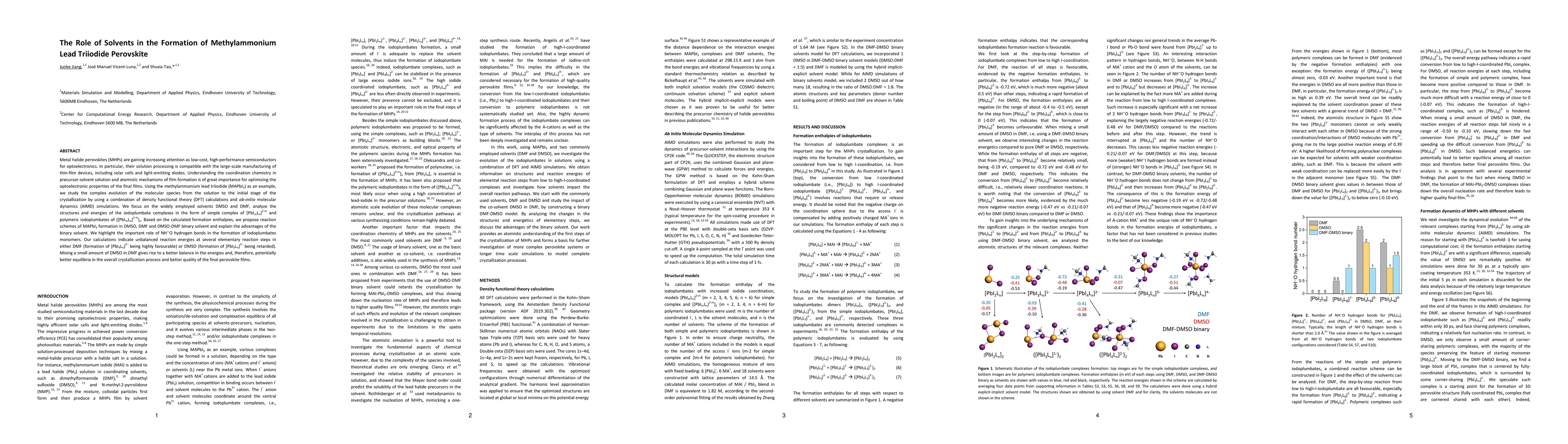 This paper investigates the role of solvents, specifically DMSO and DMF, in the formation of methylammonium lead triiodide perovskite using DFT and AIMD simulations. It finds that a binary solvent mixture of DMSO-DMF provides a more balanced reaction energy, leading to better crystallization and higher-quality perovskite films, highlighting the importance of NH-O hydrogen bonds in the process.