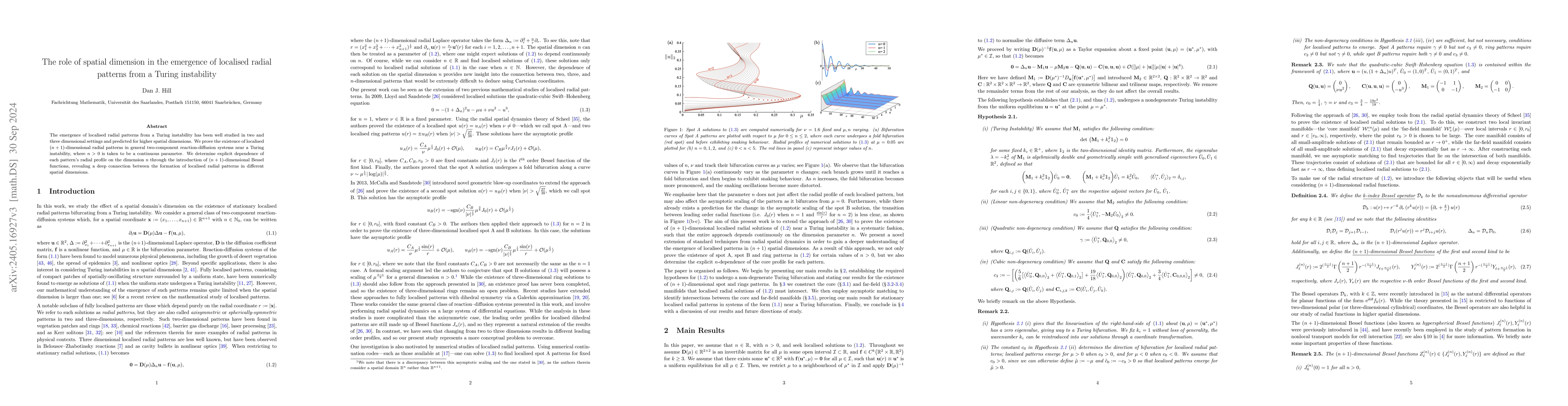 The paper proves the existence of localised $(n+1)$-dimensional radial patterns in reaction-diffusion systems near a Turing instability, showing explicit radial profile dependence on spatial dimension $n$ via $(n+1)$-dimensional Bessel functions. It reveals a profound link between the formation of localised radial patterns across varying dimensions.
