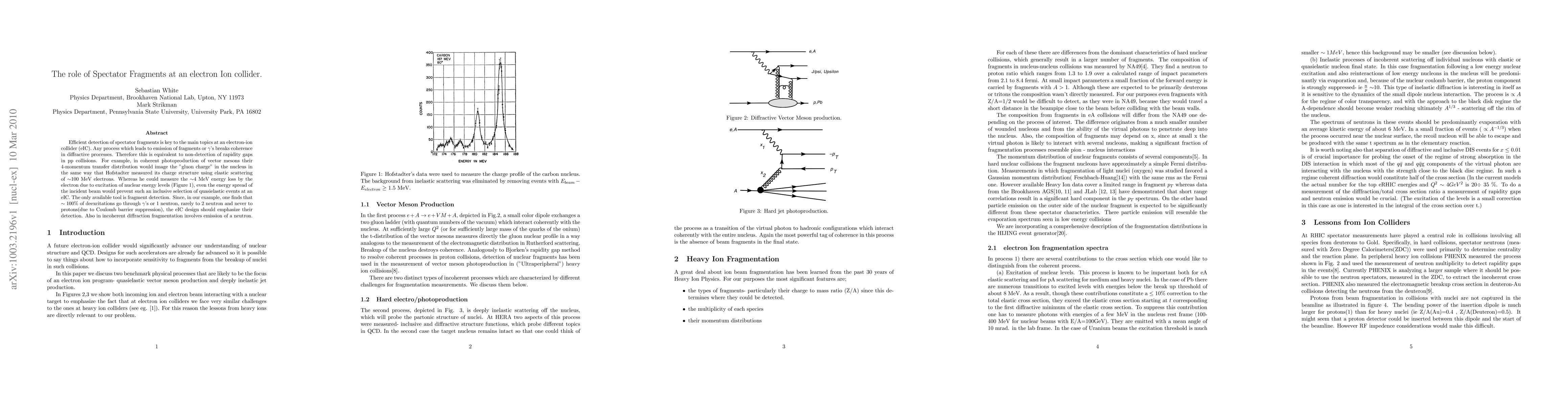 Efficient detection of spectator fragments is key to the main topics at an electron-ion collider (eIC). Any process which leads to emission of fragments or $\gamma$'s breaks coherence in diffractive processes. Therefore this is equivalent to non-detection of rapidity gaps in pp collisions. For example, in coherent photoproduction of vector mesons their 4-momentum transfer distribution would image the "gluon charge" in the nucleus in the same way that Hofstadter measured its charge structure using elastic scattering of $\sim$100 MeV electrons. Whereas he could measure the $\sim$4 MeV energy loss by the electron due to excitation of nuclear energy levels (Figure 1), even the energy spread of the incident beam would prevent such an inclusive selection of quasielastic events at an eIC. The only available tool is fragment detection. Since, in our example, one finds that $\sim100$ of deexcitations go through $\gamma$'s or 1 neutron, rarely to 2 neutron and never to protons(due to Coulomb barrier suppression), the eIC design should emphasize their detection.