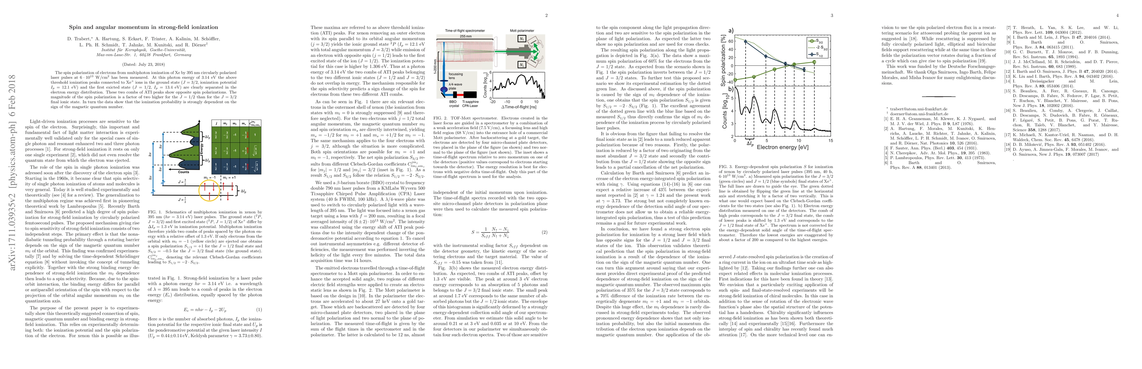 The spin polarization of electrons from multiphoton ionization of Xe by 395 nm circularly polarized laser pulses at $6\cdot10^{13}$ W/cm$^2$ has been measured. At this photon energy of 3.14 eV the above threshold ionization peaks connected to Xe$^+$ ions in the ground state ($J=3/2$, ionization potential $I_p=12.1$ eV) and the first exicted state ($J=1/2$, $I_p=13.4$ eV) are clearly separated in the electron energy distribution. These two combs of ATI peaks show opposite spin polarizations. The magnitude of the spin polarization is a factor of two higher for the $J=1/2$ than for the $J=3/2$ final ionic state. In turn the data show that the ionization probability is strongly dependent on the sign of the magnetic quantum number.