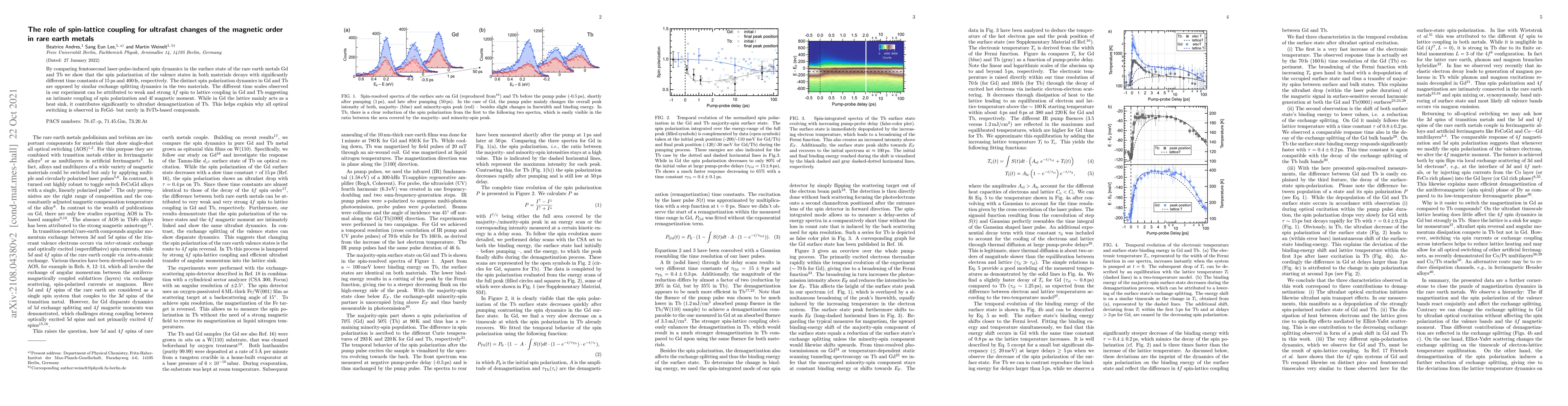 This study investigates ultrafast magnetization changes in rare earth metals Gd and Tb, revealing that their spin polarization decays with different time constants due to varying $4f$ spin-lattice coupling strengths. Gd exhibits weak coupling, acting mainly as a heat sink, while Tb's strong coupling significantly contributes to ultrafast demagnetization.