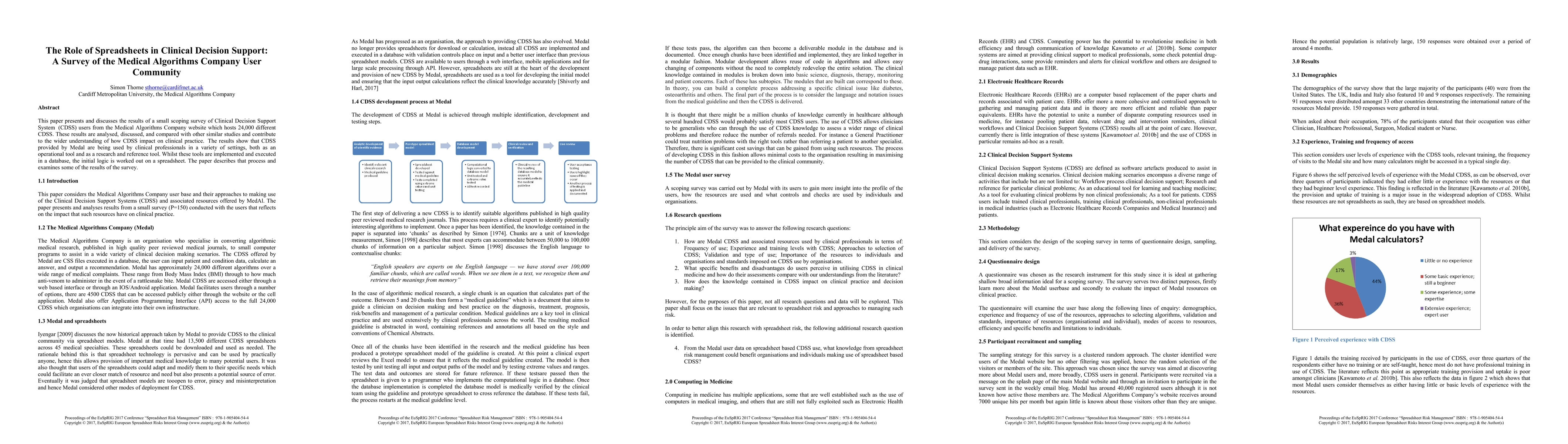 This paper presents and discusses the results of a small scoping survey of Clinical Decision Support System (CDSS) users from the Medical Algorithms Company website which hosts 24,000 different CDSS. These results are analysed, discussed, and compared with other similar studies and contribute to the wider understanding of how CDSS impact on clinical practice. The results show that CDSS provided by Medal are being used by clinical professionals in a variety of settings, both as an operational tool and as a research and reference tool. Whilst these tools are implemented and executed in a database, the initial logic is worked out on a spreadsheet. The paper describes that process and examines some of the results of the survey.