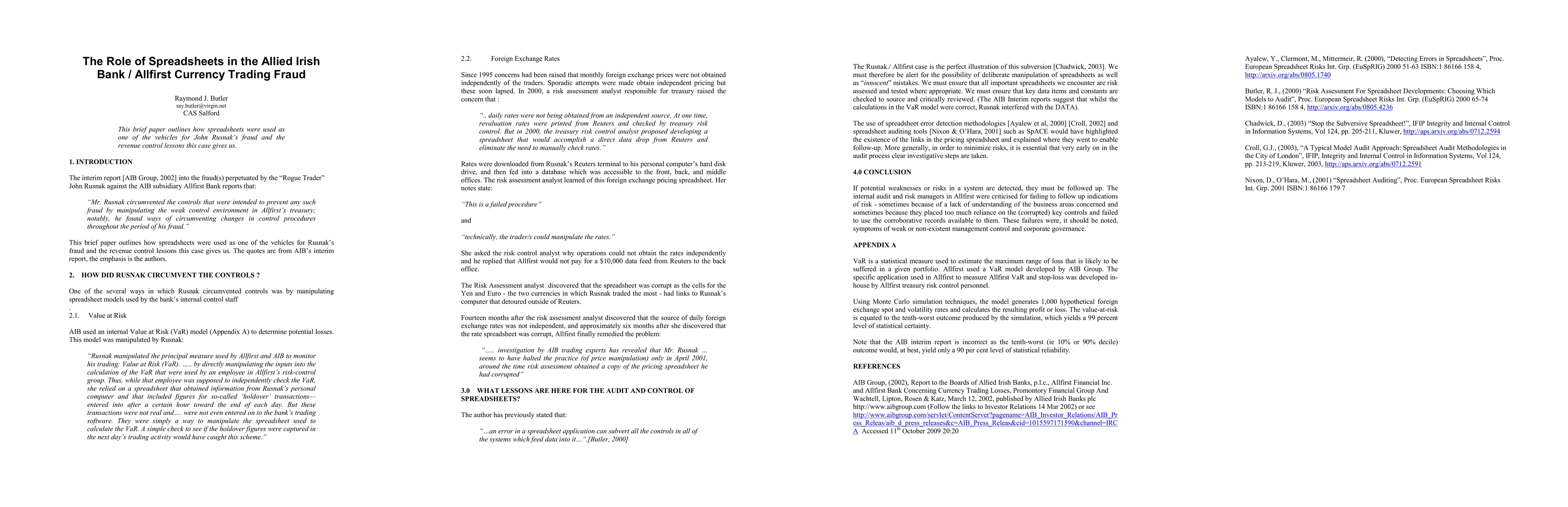 This brief paper outlines how spreadsheets were used as one of the vehicles for John Rusnak's fraud and the revenue control lessons this case gives us.
