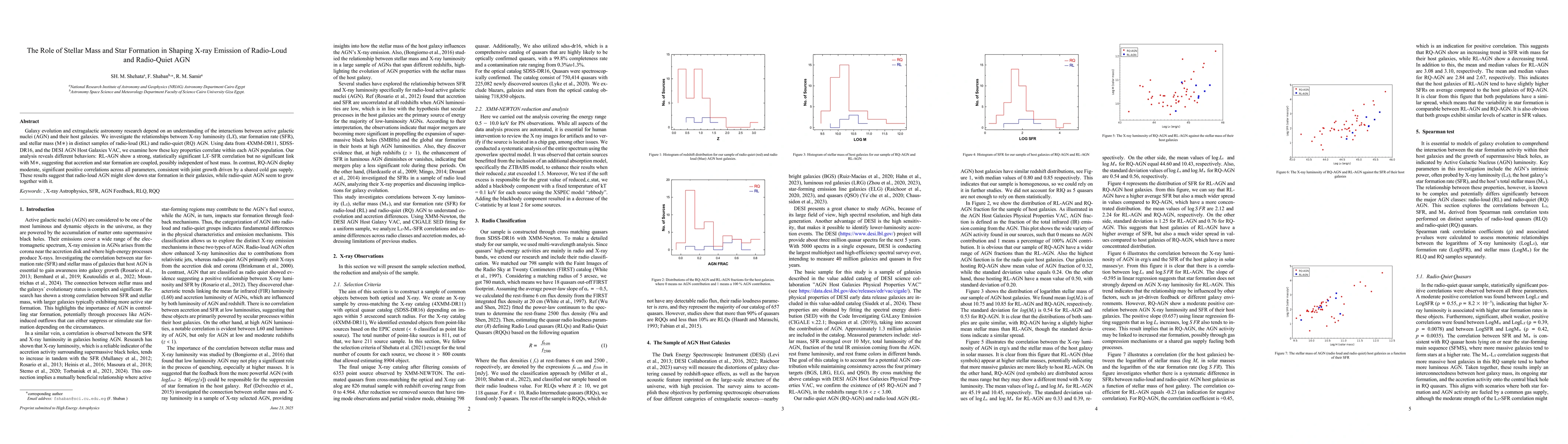 Galaxy evolution and extragalactic astronomy research depend on an understanding of the interactions between active galactic nuclei (AGN) and their host galaxies. We investigate the relationships between X-ray luminosity (Lx), star formation rate (SFR), and stellar mass (M) in distinct samples of radio-loud (RL) and radio-quiet (RQ) AGN. Using data from 4XMM-DR11, SDSS-DR16, and the DESI AGN Host Galaxies VAC, we examine how these key properties correlate within each AGN population. Our analysis reveals different behaviors: RL-AGN show a strong, statistically significant Lx-SFR correlation but no significant link with M, suggesting that accretion and star formation are coupled, possibly independent of host mass. In contrast, RQ-AGN display moderate, significant positive correlations across all parameters, consistent with joint growth driven by a shared cold gas supply.These results suggest that radio-loud AGN might slow down star formation in their galaxies, while radio-quiet AGN seem to grow together with it.