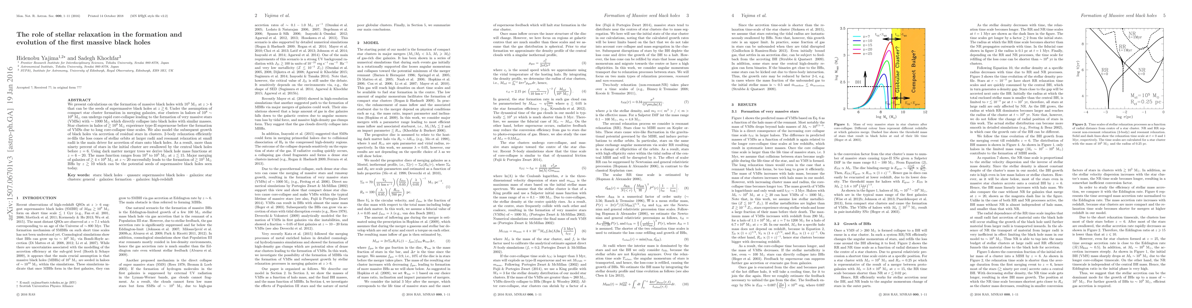 This paper explores the formation of massive black holes (10^5 Msun) at high redshifts (z > 6) through stellar relaxation in compact star clusters. It finds that core-collapse in star clusters within 10^8-10^9 Msun halos leads to the formation of very massive stars that directly collapse into black holes, while larger halos experience type-II supernovae before VMS formation. Stellar accretion via 2-body relaxation and resonant relaxation drives black hole growth.