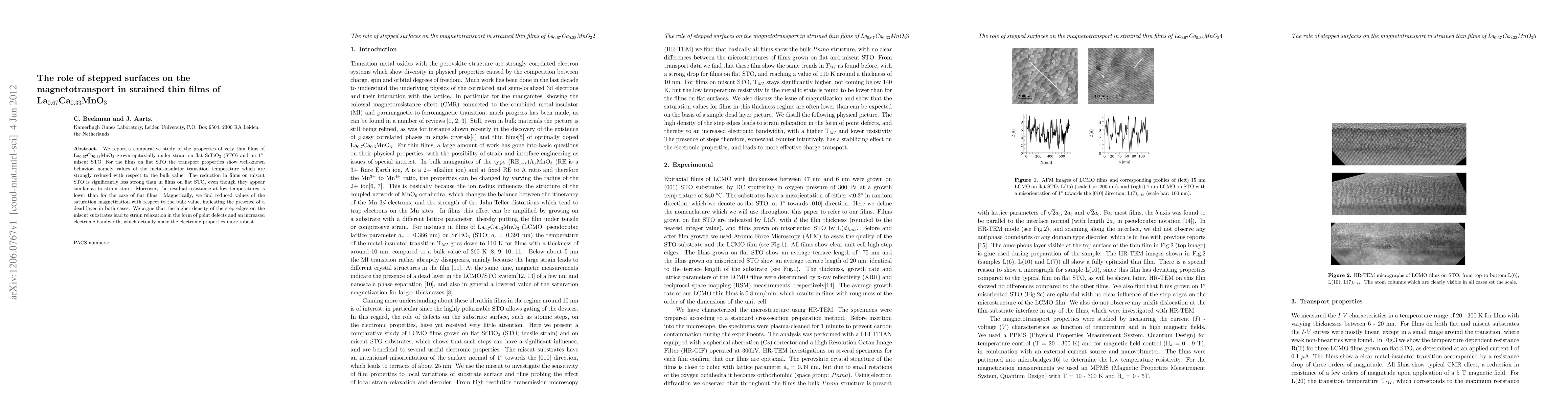 This study investigates the magnetotransport properties of strained La0.67Ca0.33MnO3 thin films on flat versus miscut SrTiO3 substrates, revealing that films on miscut substrates exhibit less reduction in metal-insulator transition temperature and lower residual resistance due to strain relaxation and increased electronic bandwidth from stepped surfaces.