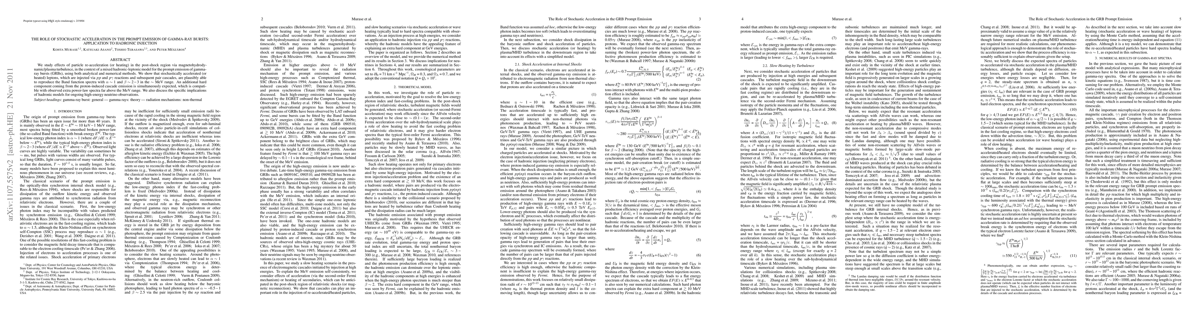 We study effects of particle re-acceleration (or heating) in the post-shock region via magnetohydrodynamic/plasma turbulence, in the context of a mixed hadronic-leptonic model for the prompt emission of gamma-ray bursts (GRBs), using both analytical and numerical methods. We show that stochastically accelerated (or heated) leptons, which are injected via pp and pg reactions and subsequent pair cascades, are plausibly able to reproduce the Band function spectra with alpha~1 and beta~2-3 in the ~MeV range. An additional hard component coming from the proton-induced cascade emission is simultaneously expected, which is compatible with observed extra power-law spectra far above the MeV range. We also discuss the specific implications of hadronic models for ongoing high-energy neutrino observations.