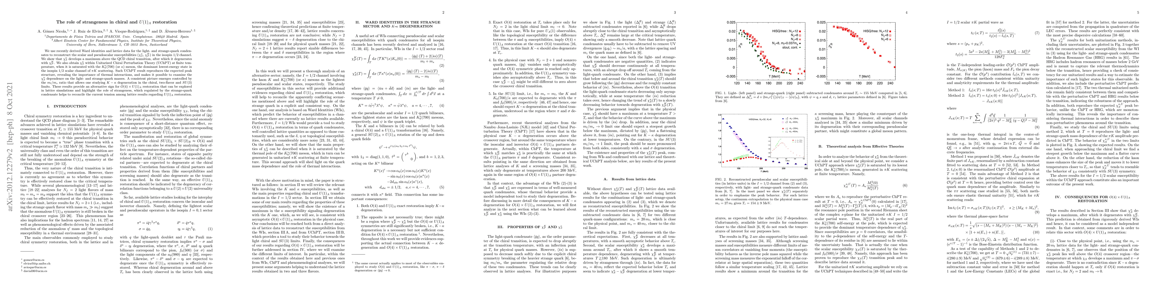 This paper investigates the role of strangeness in chiral and $U(1)_A$ restoration using Ward identities and lattice data. It finds that the scalar susceptibility $\chi_S^\kappa$ peaks above the QCD chiral transition, merging with the pseudoscalar susceptibility $\chi_P^K$, and reveals the importance of thermal interactions in this process.