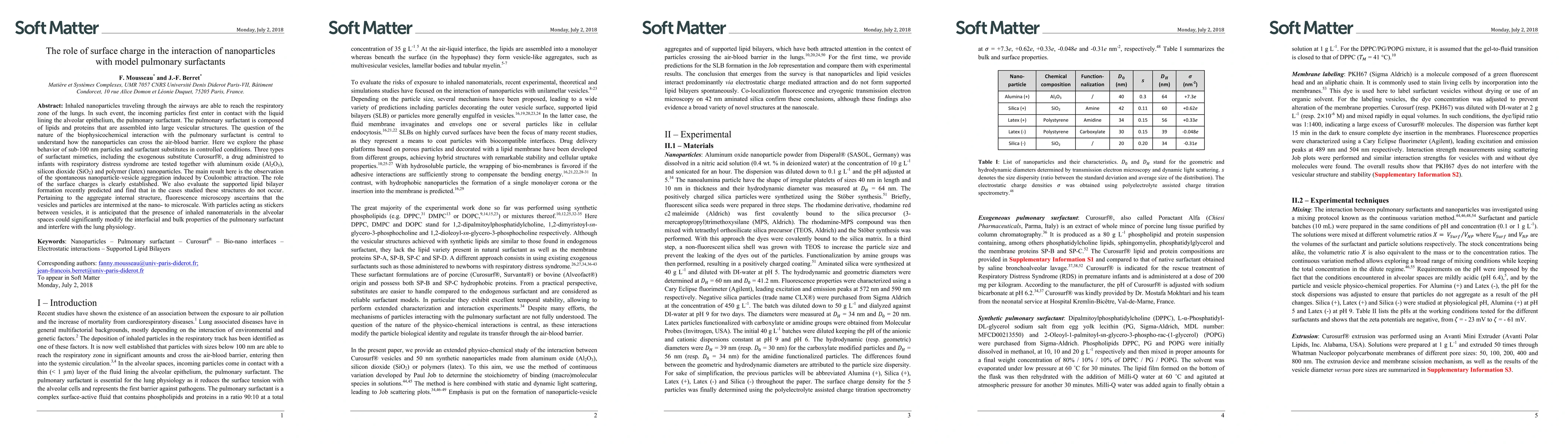 Inhaled nanoparticles traveling through the airways are able to reach the respiratory zone of the lungs. In such event, the incoming particles first enter in contact with the liquid lining the alveolar epithelium, the pulmonary surfactant. The pulmonary surfactant is composed of lipids and proteins that are assembled into large vesicular structures. The question of the nature of the biophysicochemical interaction with the pulmonary surfactant is central to understand how the nanoparticles can cross the air-blood barrier. Here we explore the phase behavior of sub-100 nm particles and surfactant substitutes in controlled conditions. Three types of surfactant mimetics, including the exogenous substitute Curosurf, a drug administred to infants with respiratory distress syndrome are tested together with aluminum oxide (Al2O3), silicon dioxide (SiO2) and polymer (latex) nanoparticles. The main result here is the observation of the spontaneous nanoparticle-vesicle aggregation induced by Coulombic attraction. The role of the surface charges is clearly established. We also evaluate the supported lipid bilayer formation recently predicted and find that in the cases studied these structures do not occur. Pertaining to the aggregate internal structure, fluorescence microscopy ascertains that the vesicles and particles are intermixed at the nano- to microscale. With particles acting as stickers between vesicles, it is anticipated that the presence of inhaled nanomaterials in the alveolar spaces could significantly modify the interfacial and bulk properties of the pulmonary surfactant and interfere with the lung physiology.