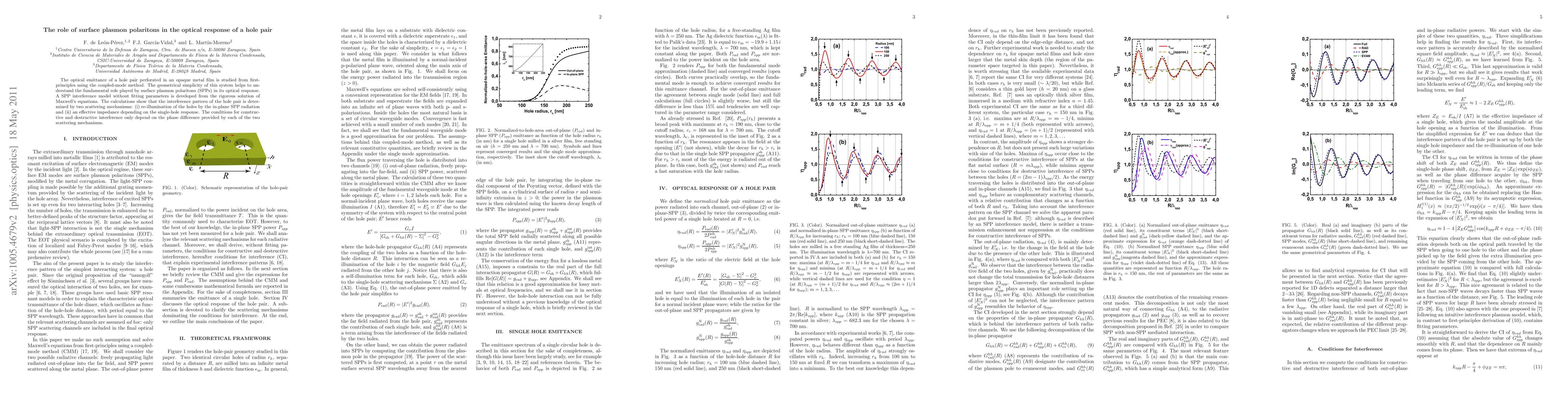 This paper investigates the optical response of a hole pair in an opaque metal film using first-principles and the coupled-mode method. It reveals that surface plasmon polaritons (SPPs) play a fundamental role, with interference patterns determined by two scattering mechanisms: re-illumination by in-plane SPP radiation and effective impedance based on single-hole response.