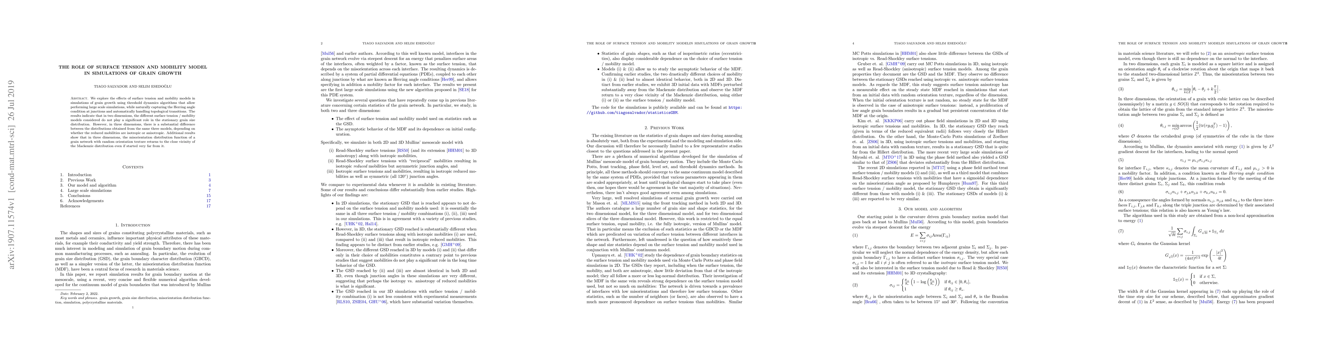 We explore the effects of surface tension and mobility models in simulations of grain growth using threshold dynamics algorithms that allow performing large scale simulations, while naturally capturing the Herring angle condition at junctions and automatically handling topological transitions. The results indicate that in two dimensions, the different surface tension / mobility models considered do not play a significant role in the stationary grain size distribution. However, in three dimensions, there is a substantial difference between the distributions obtained from the same three models, depending on whether the reduced mobilities are isotropic or anisotropic. Additional results show that in three dimensions, the misorientation distribution function of a grain network with random orientation texture returns to the close vicinity of the Mackenzie distribution even if started very far from it.